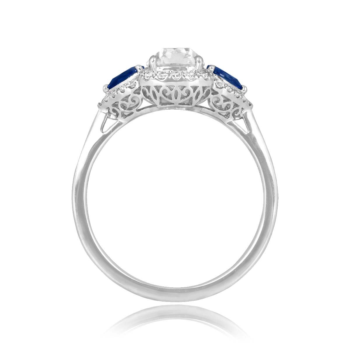 This ring features a cushion cut GIA certified 1.01 carat center diamond with a I color and VS1 clarity. Accenting the center stone are two pear shaped sapphire stones weighting a total of 0.43 carats. Halos of single cut diamonds surround the center and accenting stones. The under-gallery showcases detailed openwork designs. This ring was handcrafted in platinum.
