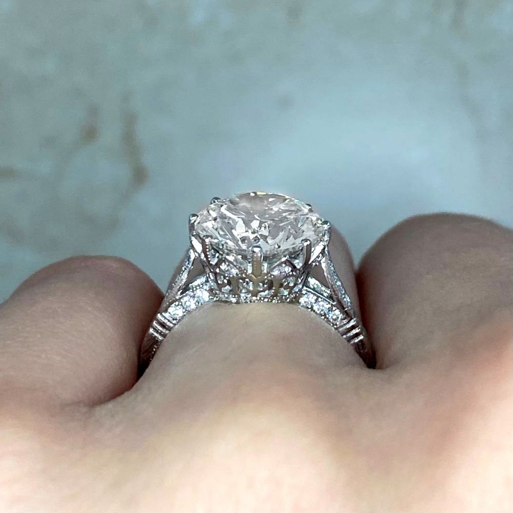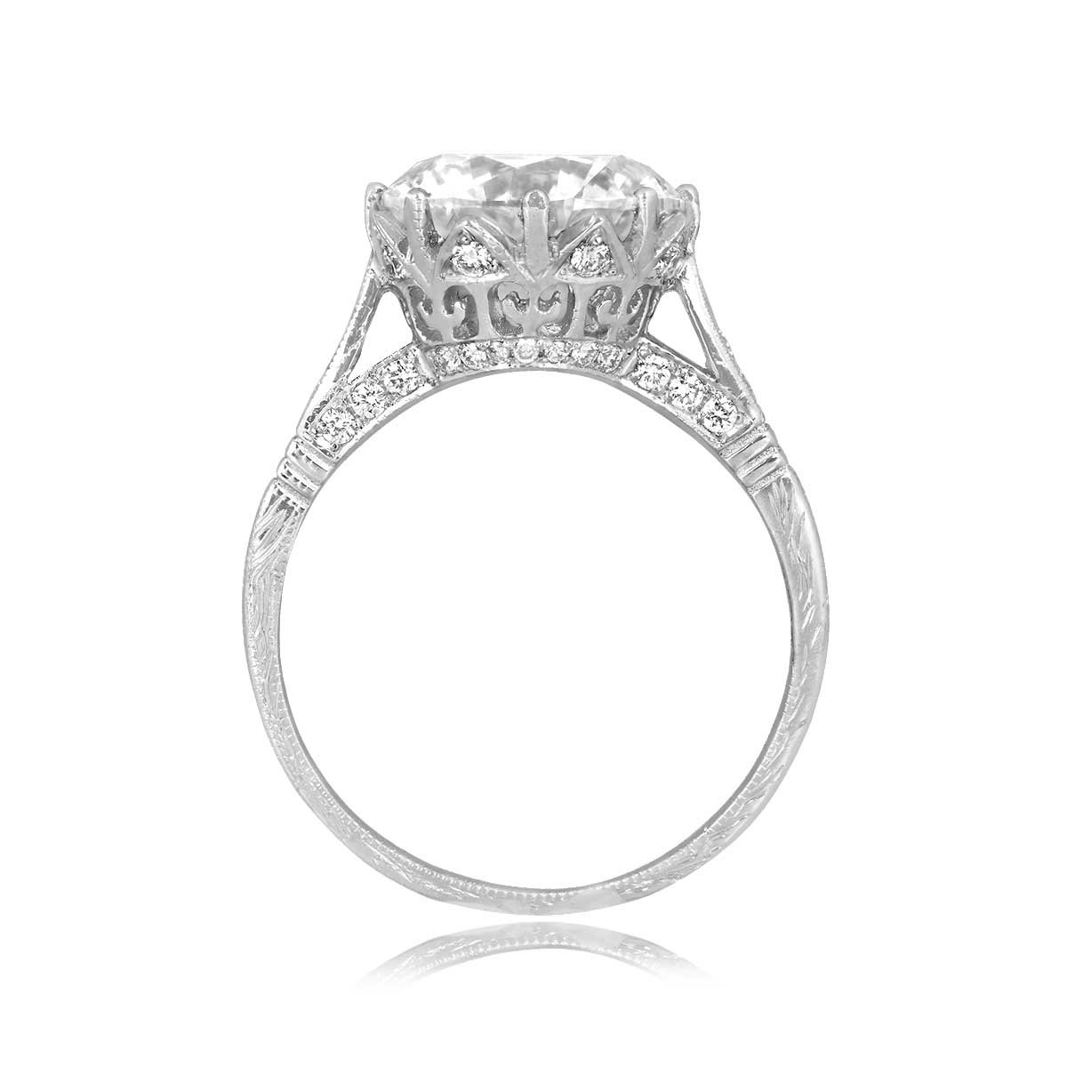 This ring features a GIA certified 4.01 carat center diamond with an I color and SI1 clarity. The diamond is mounted in a crown-style setting adorned with diamonds and openwork detailing. Additional diamonds decorate the shoulders leading to a hand engraved shank. The additional diamonds weigh a total of approximately 0.44 carats. This ring was made in platinum.