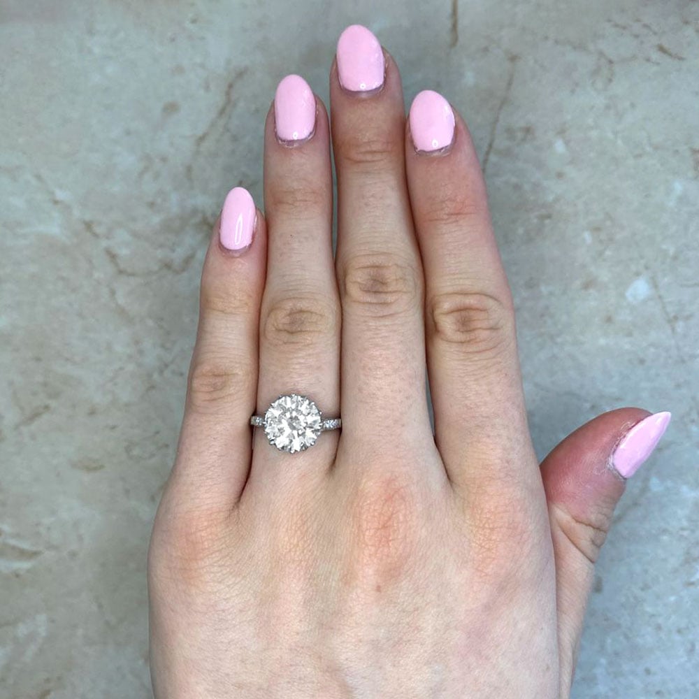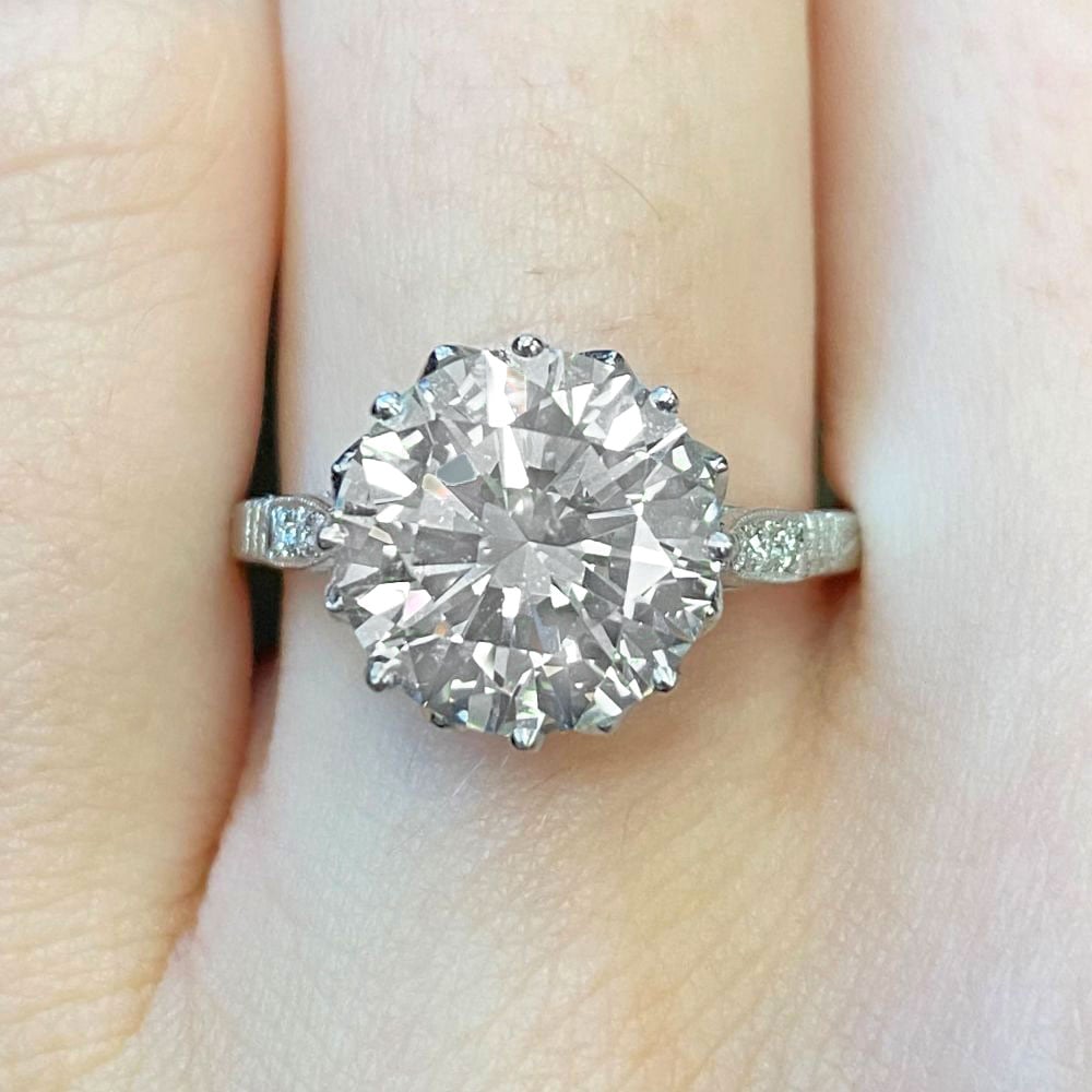 A Word from the Jeweler: I’m especially drawn to the way the crown-style mounting in platinum elevates the large center diamond, giving it a stately presence. The diamond accents along the shoulders add just the right touch of brilliance, making this a ring I’m proud to feature.
