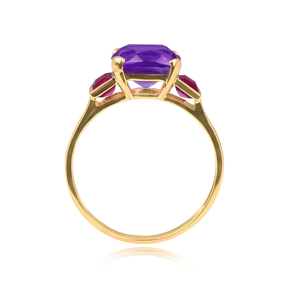 A beautiful gemstone ring featuring a 1.89 carat cushion-cut amethyst that is prong-set and accented by baguette-cut ruby on either side. The total weight of the rubies is approximately 0.45 carats. This ring is handcrafted in 18k yellow gold.