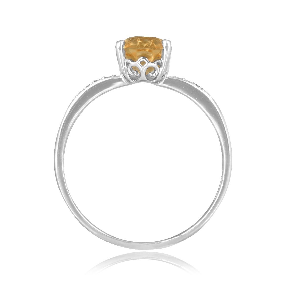 This ring features a 1.32 carat oval cut citrine center stone set in a prong setting. The shoulders are decorated with pave-set diamonds. The under-gallery of this ring showcases intricate open work designs. This ring is made in 14k white gold.