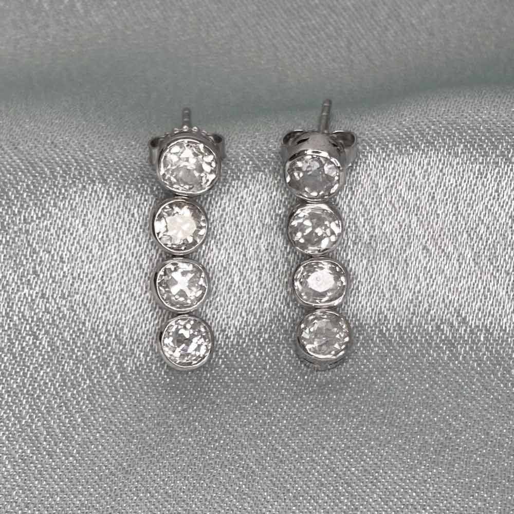 These earrings feature a hanging design with four bezel-set diamonds on each earring. The diamonds weigh a total of approximately 2.46 carats with a K-L color and Vs2-SI1 clarity. These earrings are handcrafted in platinum.