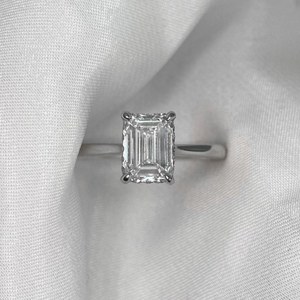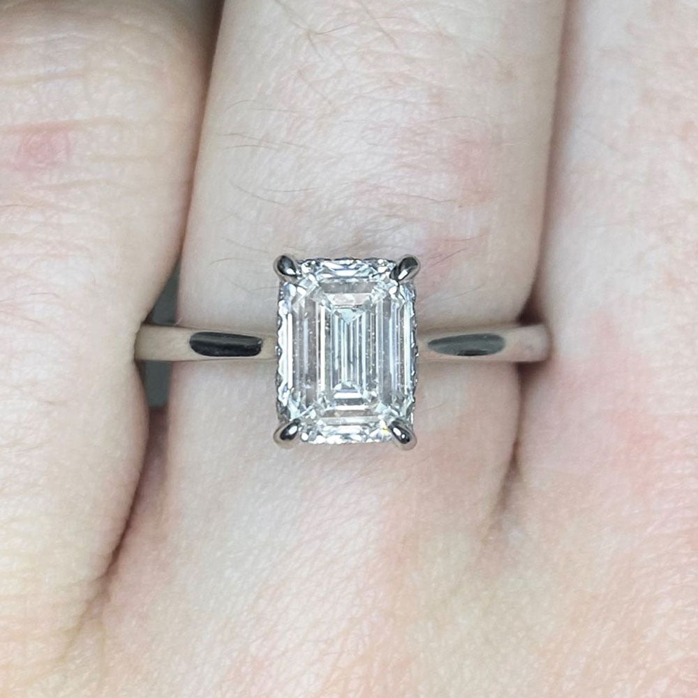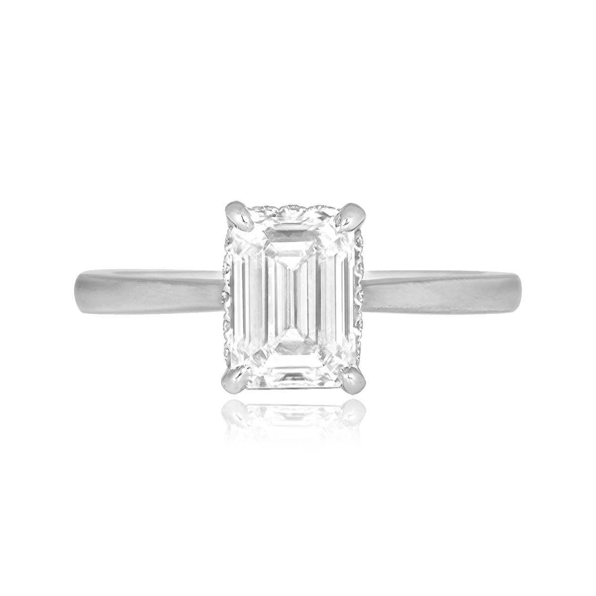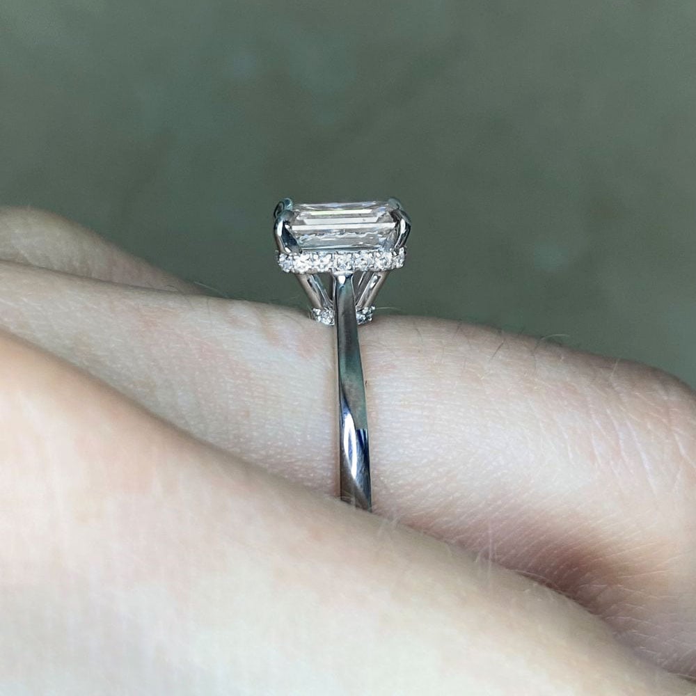 A Word from the Jeweler: I was drawn to this platinum ring for its emerald-cut center stone, which has such a refined presence that you instantly see why it stands out. The hidden halo tucked into the under-gallery adds a thoughtful touch that elevates this ring in captivating way.