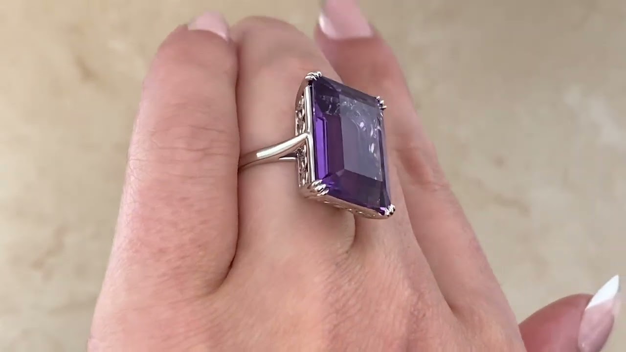 A bold ring featuring an emerald-cut amethyst center stone weighing 14 carats. An openwork under-gallery further enhances the ring. This ring was handcrafted in platinum.