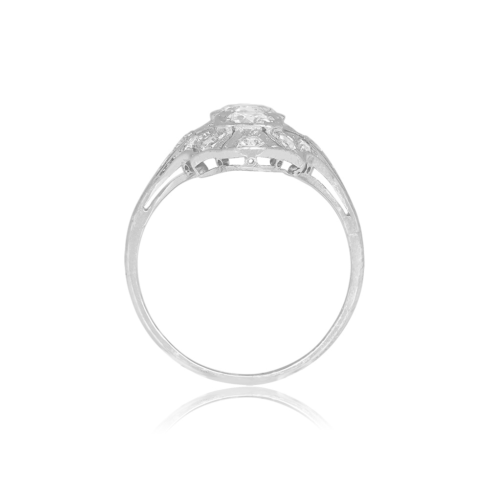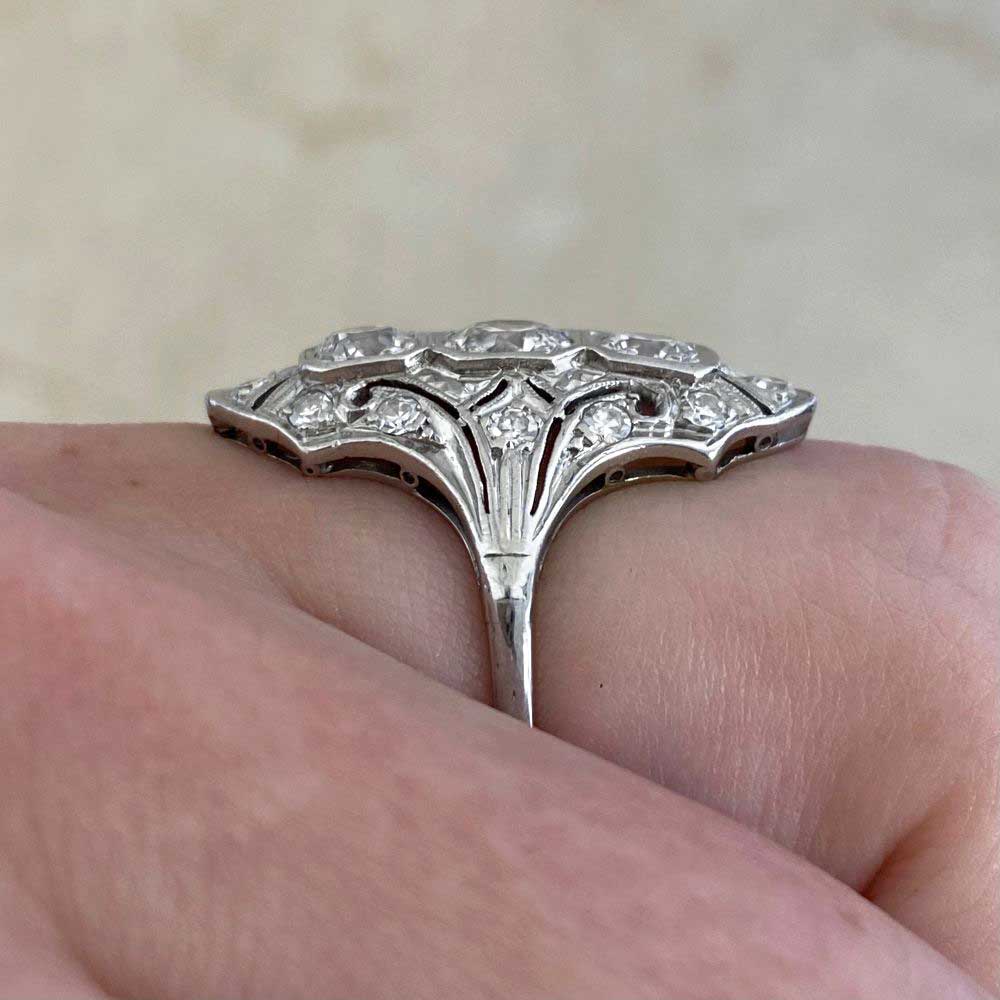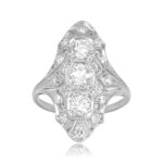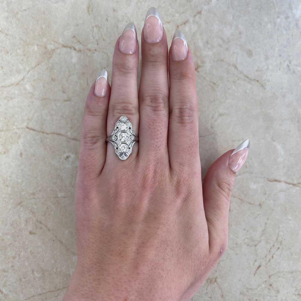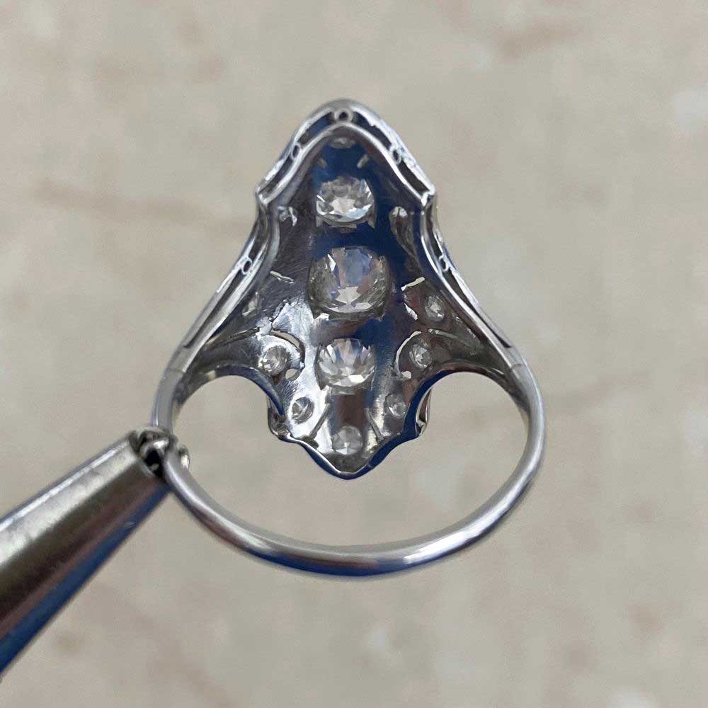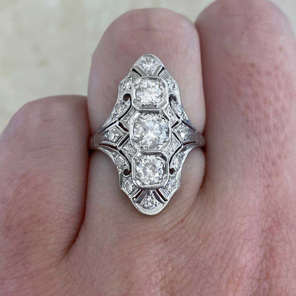 An elongated antique ring that centers three old European cut diamonds. The center stone is approximately 0.40 carats, J color and I1 clarity. The diamonds north and south of the center weigh approximately 0.40 carats total, J color, and VS2-SI1 overall clarity. Single-cut diamonds weighing approximately 0.27 carats are set along the length of the mounting. The total diamond weight is approximately 1.07 carats. Hand engravings decorate the shoulders of the shank. The ring was handcrafted in platinum during the Art Deco era, circa 1920.
