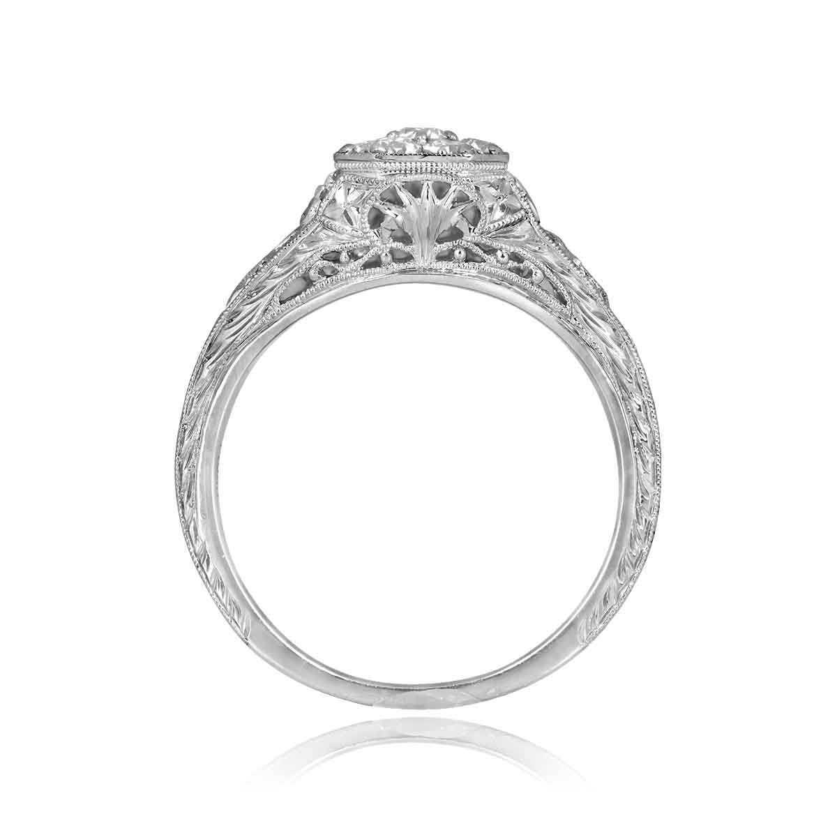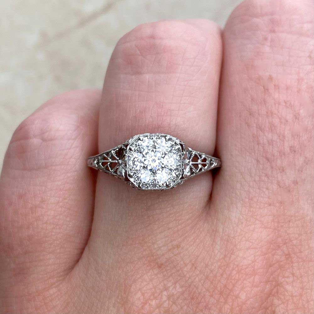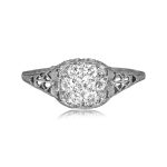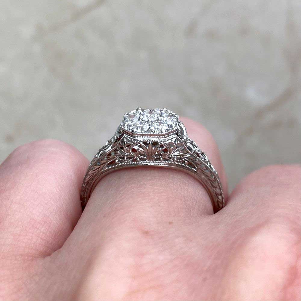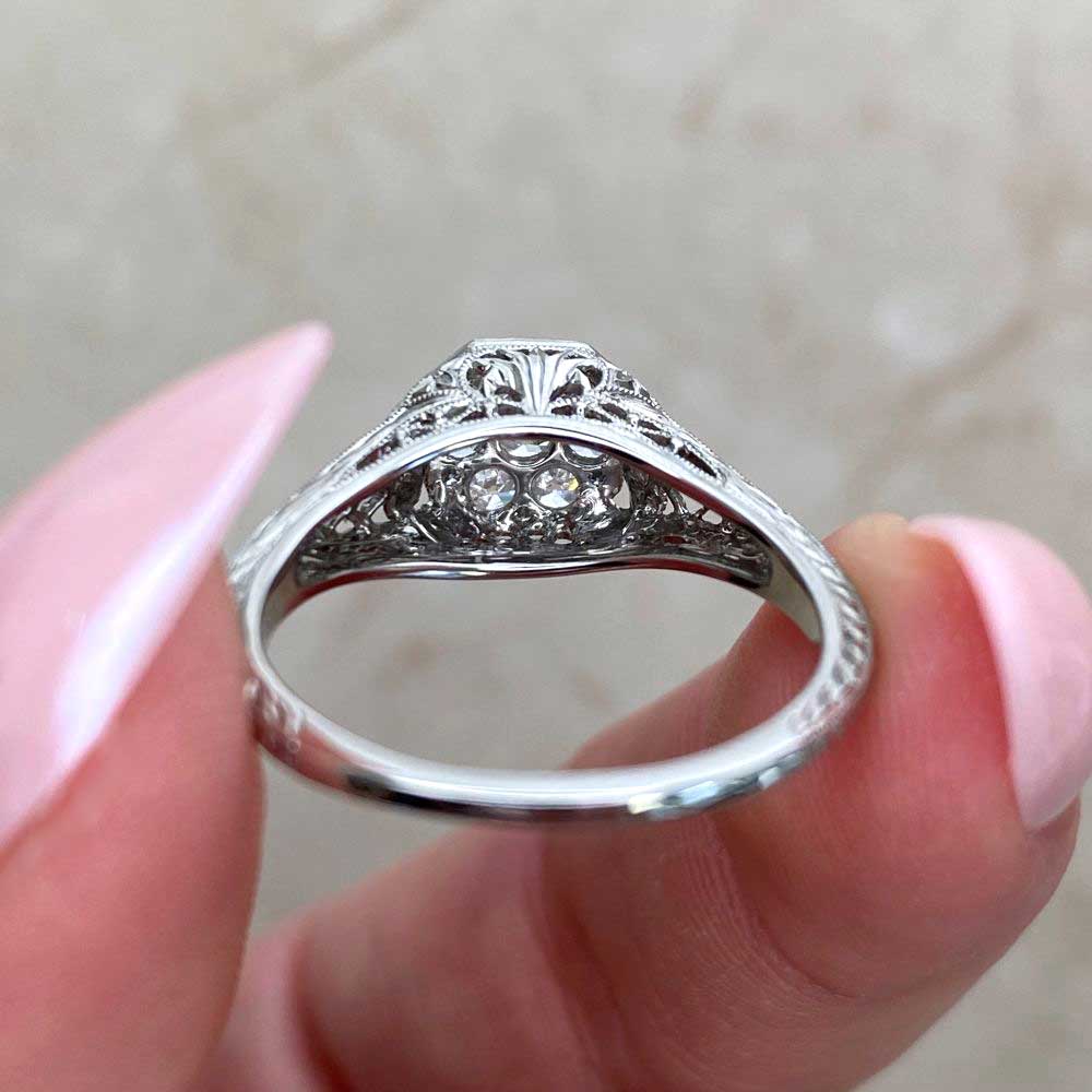This platinum ring featured a center Old European cut diamond cluster in a shared-prong setting. The shoulders and under-gallery of the ring are decorated with intricate filigree dealings. Hand-engravings halfway through the shank enhance the design.
