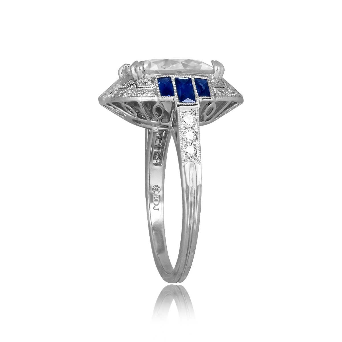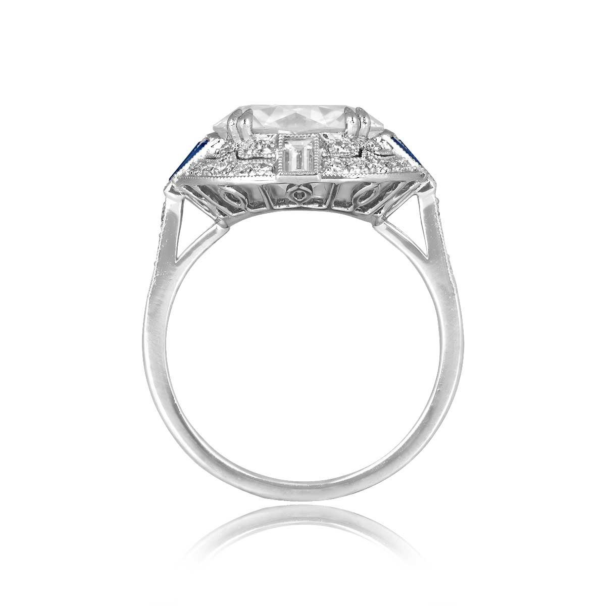 This ring features a 4.22 carat center diamond with a I color and I1 clarity. A double diamond halo surrounds the center diamond with baguette cut diamonds and French cut sapphires accenting the north-south and east-west sides of the diamond. Additional diamonds adorn the shoulders leading to a split shank design. The total additional diamond weight is approximately 0.79 carats. This ring was handcrafted in platinum.