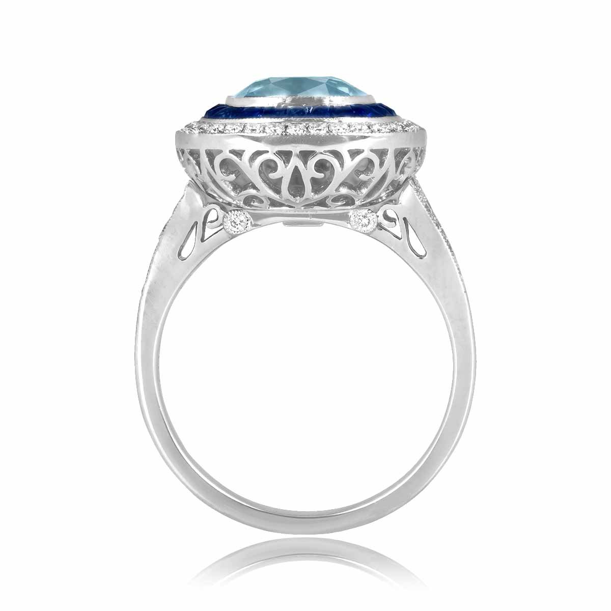 This ring centers a bezel-set 2.01 carat cushion cut aquamarine stone. Surrounding the center stone is a double halo of channel-set diamond and sapphire stones. The shoulders of this ring are decorated with a split shank adorned with additional diamonds. The diamonds weigh a total of 0.38 carats and the sapphires weigh a total of 0.58 carats. This ring features a ring-to-pendant design. this ring is made in platinum and 18k white gold.