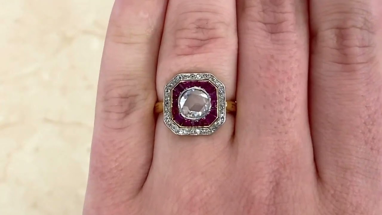 This Edwardian ring features a 0.77 carat rose cut diamond, I color and VS2 clarity. The rose cut diamond is bezel-set and surrounded by a double halo of calibre cut rubies and single cut diamonds. This ring is antique, and was handcrafted in platinum on 18k yellow gold circa 1900.