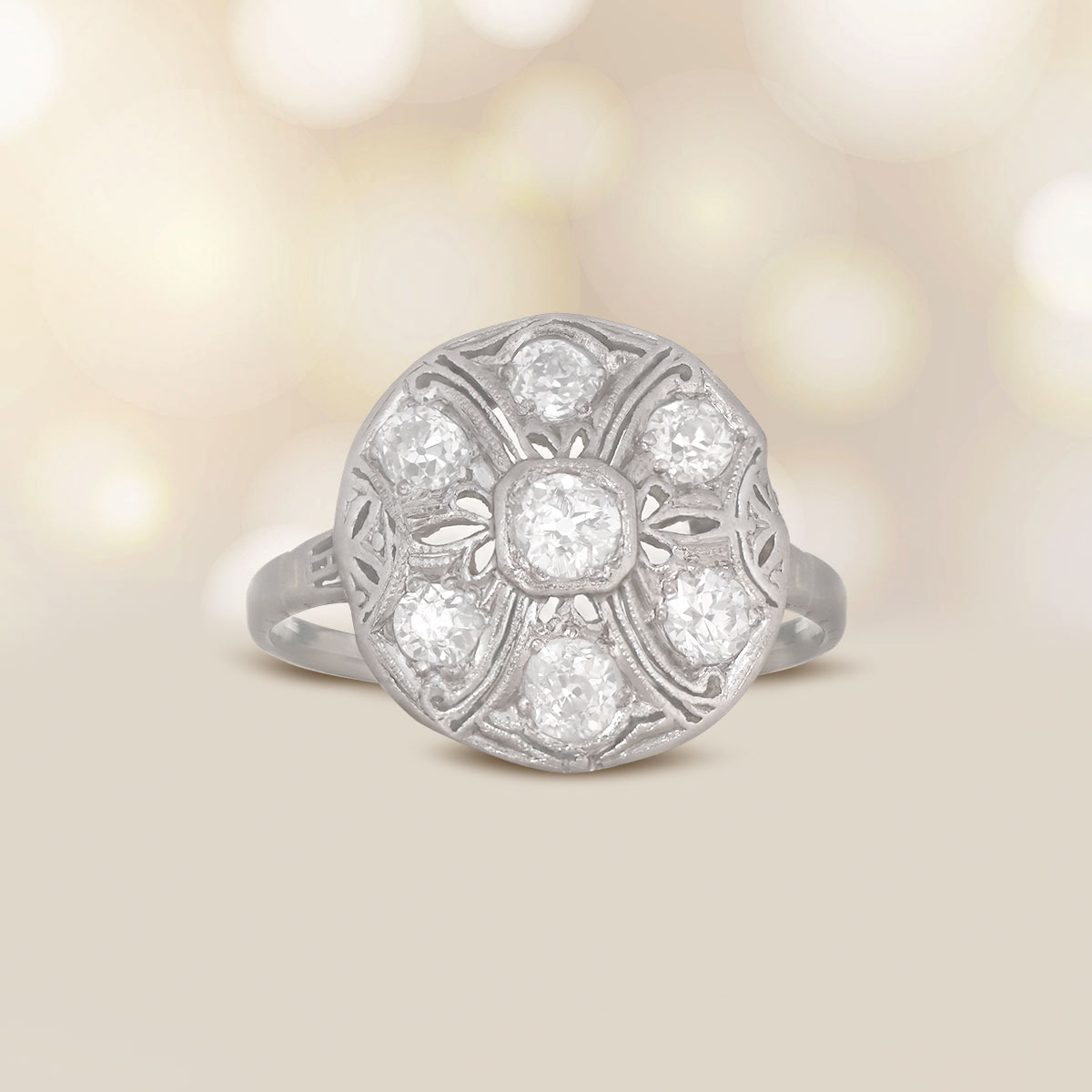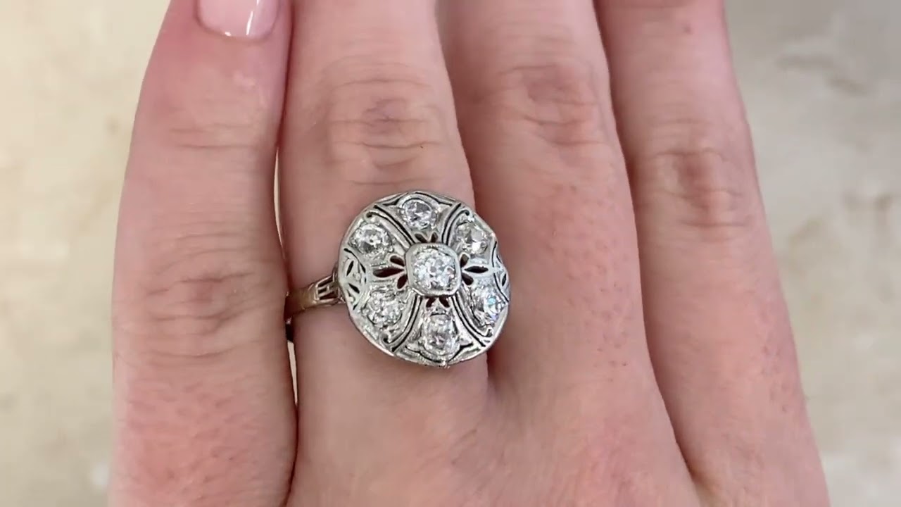 A unique diamond engagement ring, featuring old European and old mine cut diamonds. The center diamond is surrounded by smaller round diamonds that are arranged in a floral-like pattern, enhanced by filigree. The total carat weight is approximately 0.77 carats. This ring was handcrafted in platinum during the Art Deco era, circa 1920.