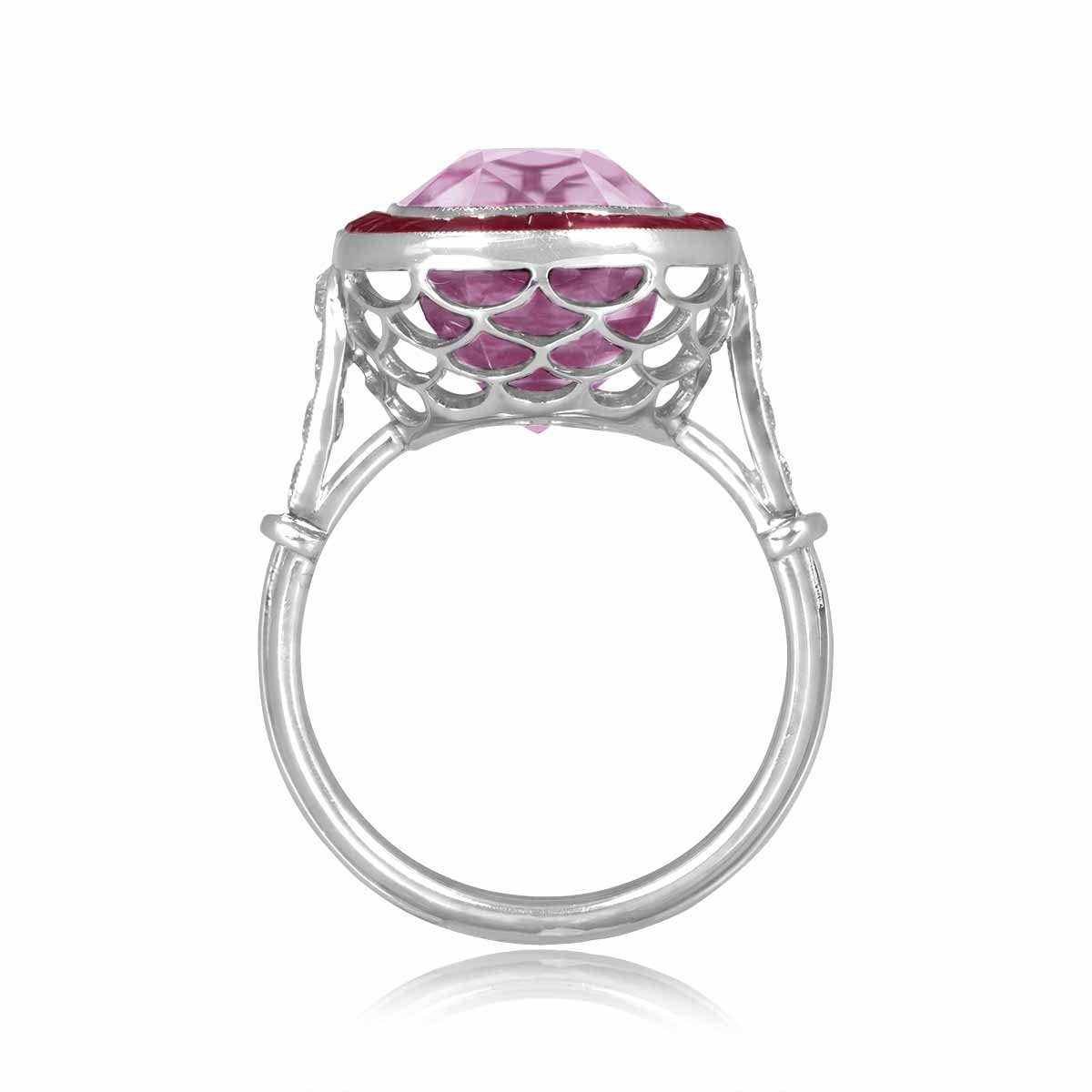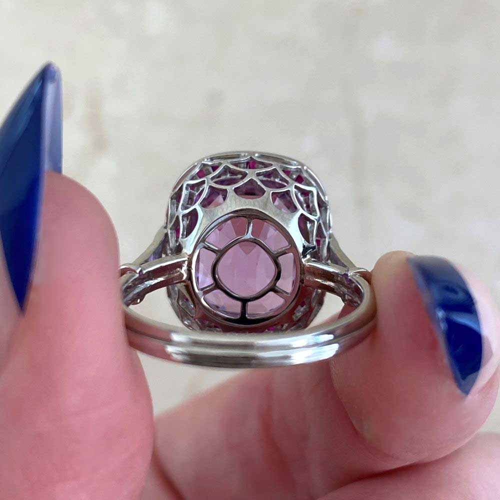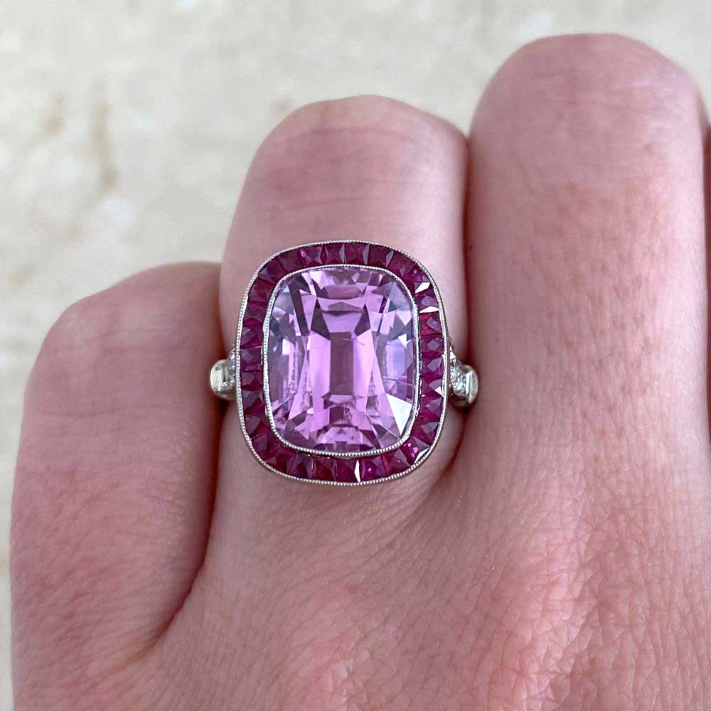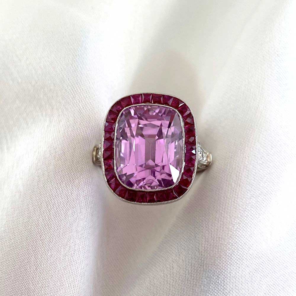 A Word from the Jeweler: The sheer size of the kunzite makes this stand out in a way that few gemstones can, especially with its vivid presence. The contrast between the pink kunzite and the red ruby halo gives it a striking look that feels bold yet refined.
