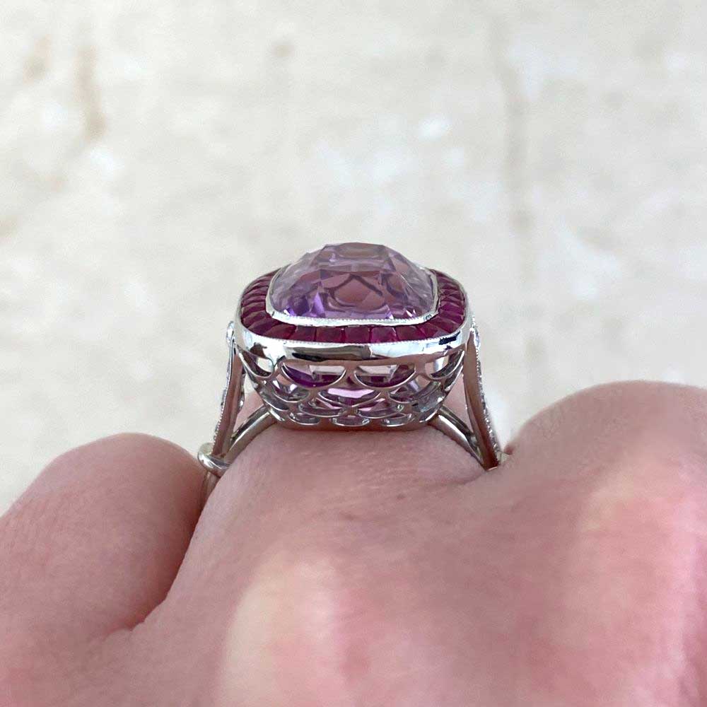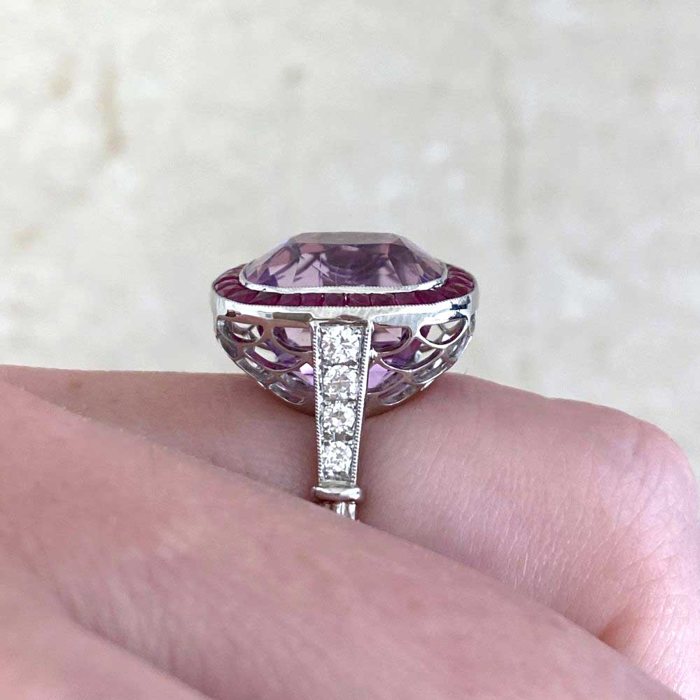 A beautiful ring showcasing a 9.93 carat cushion cut kunzite center stone with a bezel-setting. Surrounding the center stone is a halo of French cut rubies weighing a total of 1.00 carat. The shoulders of this ring are decorated with diamond details, this ring was handcrafted in platinum.