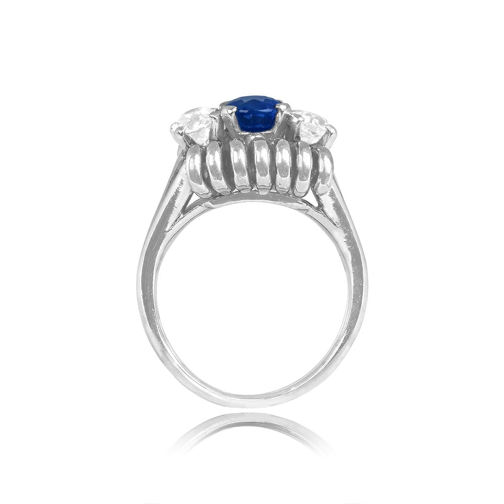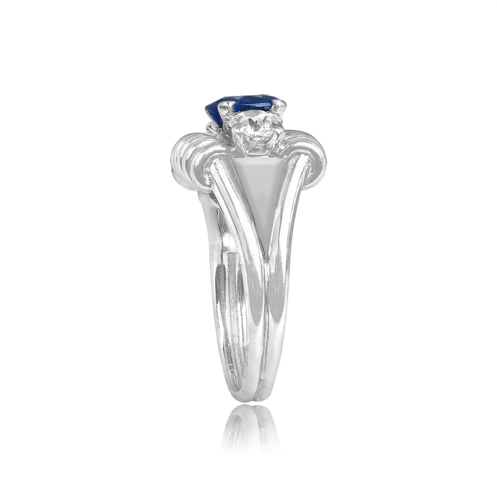A Beautiful Retro Sapphire and Diamond ring highlighting a Sapphire oval cut center stone weighing approximately 1.28 carat. Accenting the center stone are two old mine cut diamonds each weighing 0.33 carats. A detailed filigree in a spiral shape enhances the three stones along with a decorated shoulder leading to a two strap band. This ring is 18K white gold, circa 1940.