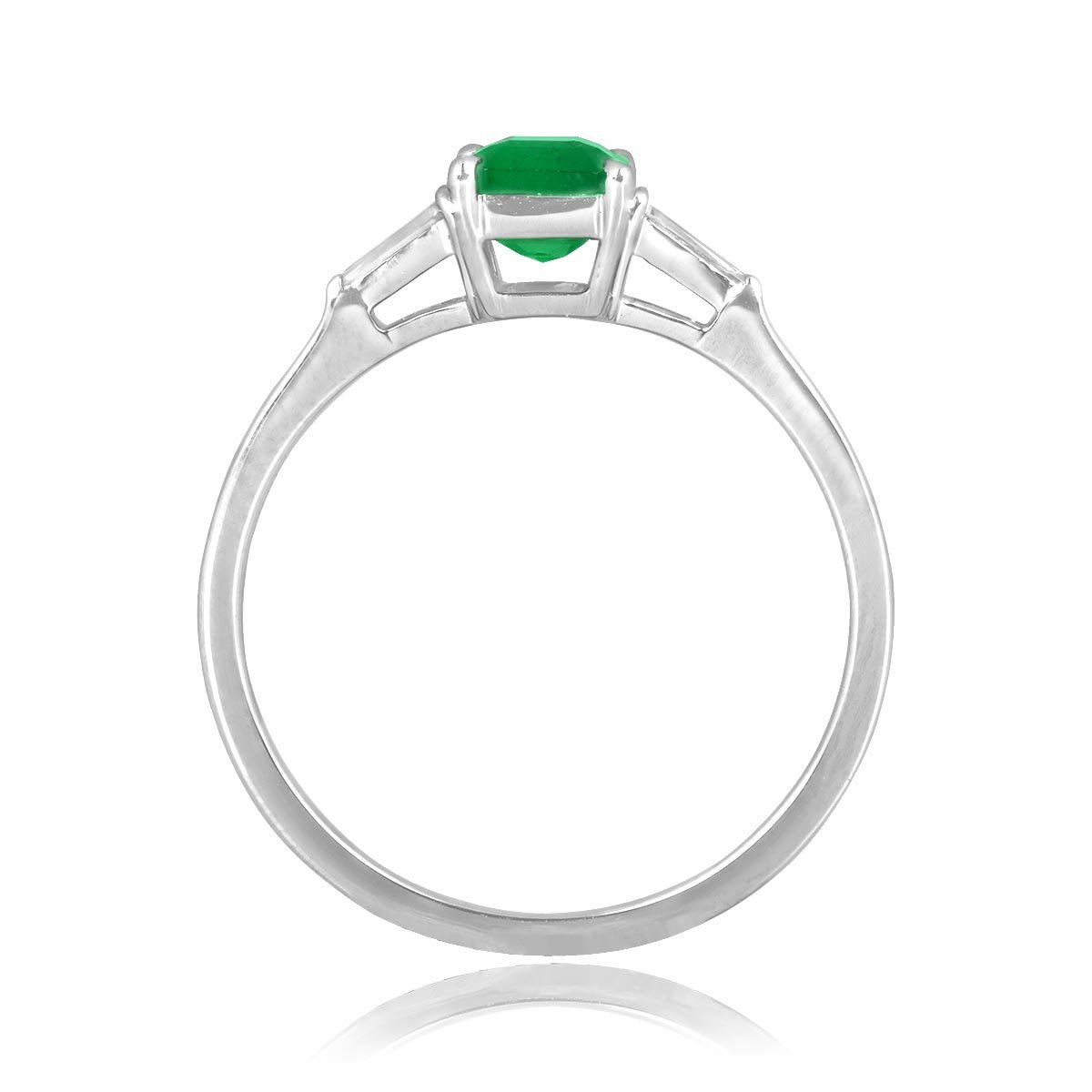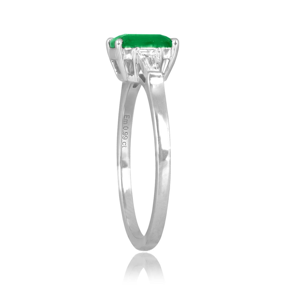 This ring features a 0.99 carat emerald-cut emerald center stone set in a prong setting. Two tapered baguette diamonds accent the center stone weighing a total of 0.20 carats. This ring is made in platinum.