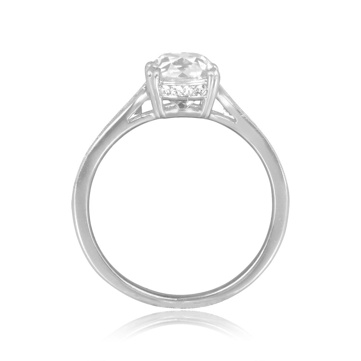 A beautiful ring highlighting a GIA certified cushion cut 1.66 carat center diamond, I color and SI2 clarity. The shoulders are decorated with baguette and carre diamonds channel set with fine milgrain. More diamond details are featured on the under-gallery. This ring is handcrafted in platinum.