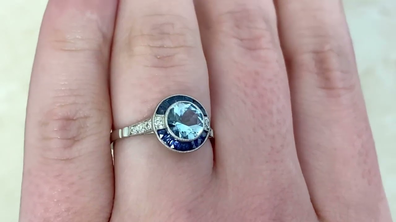 This ring centers a 0.78 carat aquamarine, bezel-set and surrounded by a halo of French cut sapphires. The total sapphire weight is approximately 0.42 carats. Old European cut diamonds are set flanking the center stone and along the shoulders. The diamonds weigh approximately 0.13 carats combined. This ring is handcrafted in platinum and decorated with an openwork under-gallery.