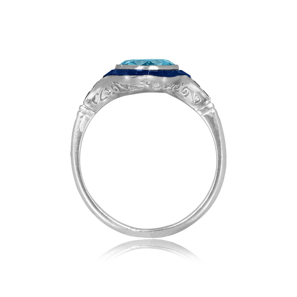 A stunning platinum ring featuring a 1.30 round aquamarine center stone with a bezel-setting. Surrounding the center stone is a sapphire halo which continues onto the shoulders. The total weight of the sapphire is 0.63 carats. The under-gallery is decorated with an open work design.