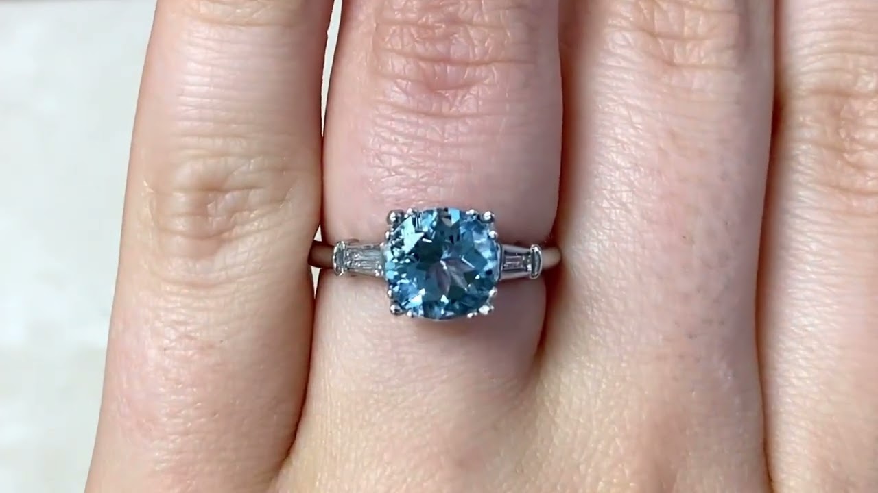 This ring features a 1.68 carat round aquamarine with excellent hue and saturation, set in prongs. Accenting the center stone are two tapered baguette cut diamonds on the shoulders. The diamonds weigh approximately 0.20 carats combined. This ring is handcrafted in platinum.