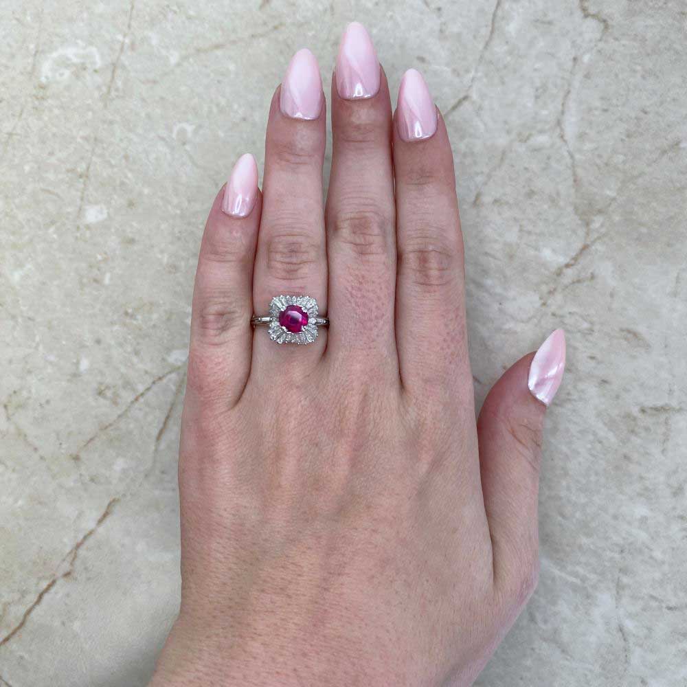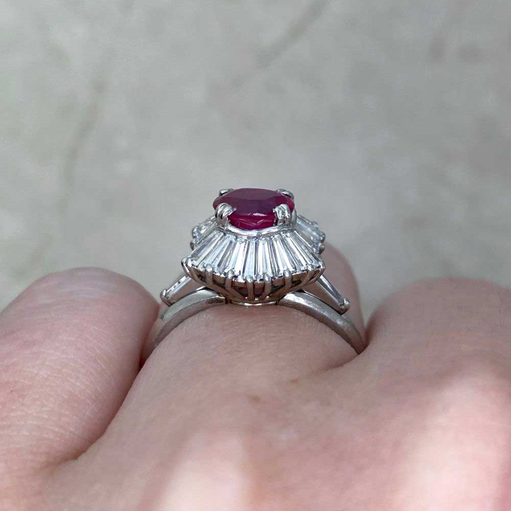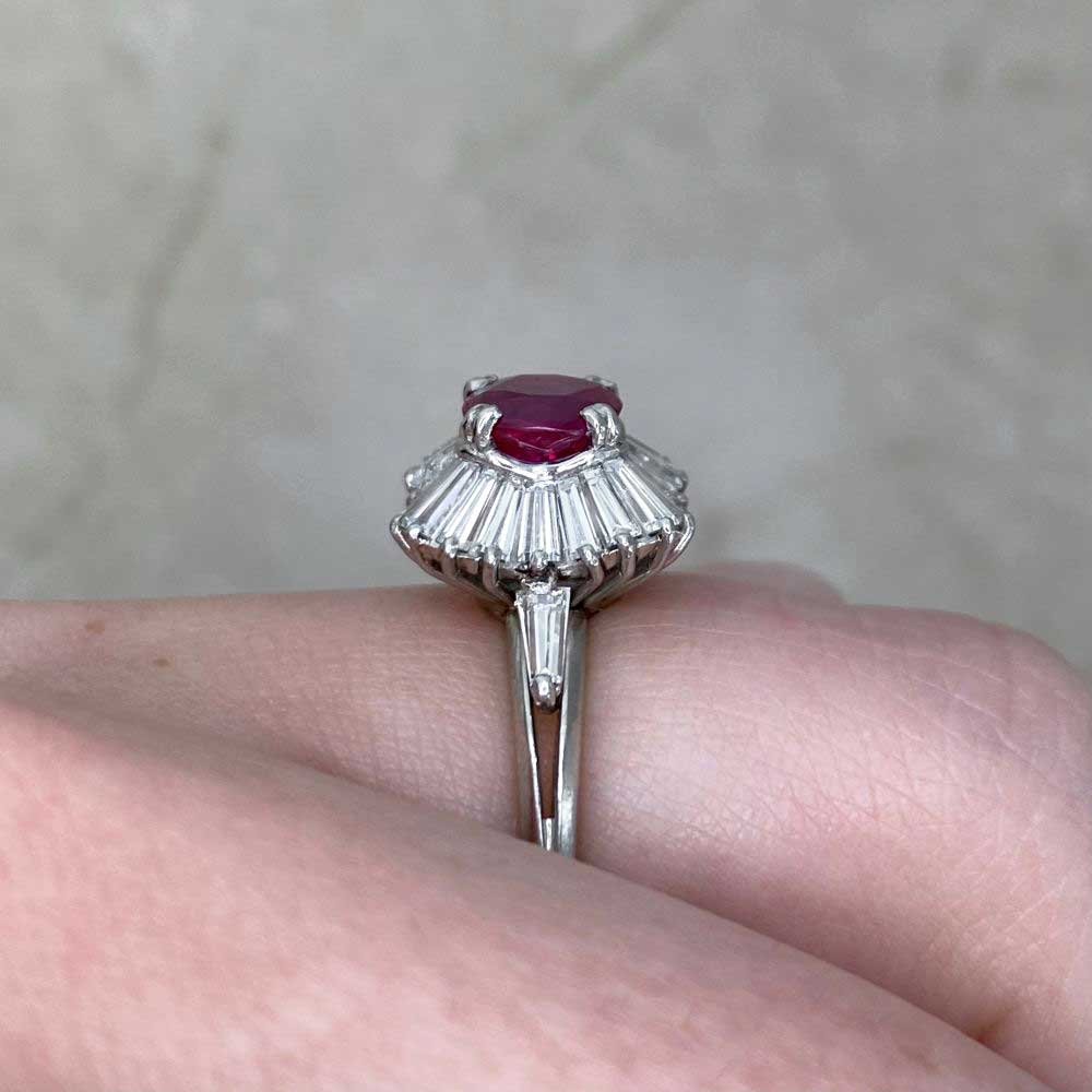 A beautiful vintage ballerina ring featuring a 1.45 carat Burmese red ruby-no heat center stone. Surrounding the center ruby are baguette shaped diamonds with additional tapered baguette diamonds on the shoulders of the ring. This ring was handcrafted in platinum, circa 1970.