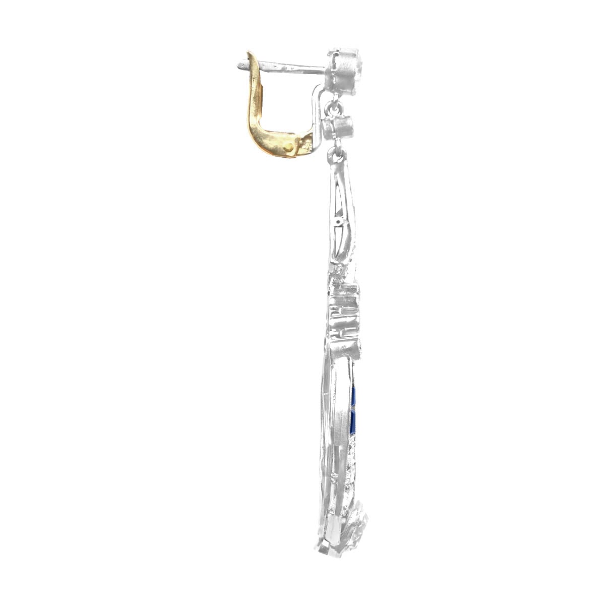 These Art Deco earrings feature intricate geometric designs showcasing diamond and sapphire stones. These earrings were made in platinum with 18k yellow gold backs.