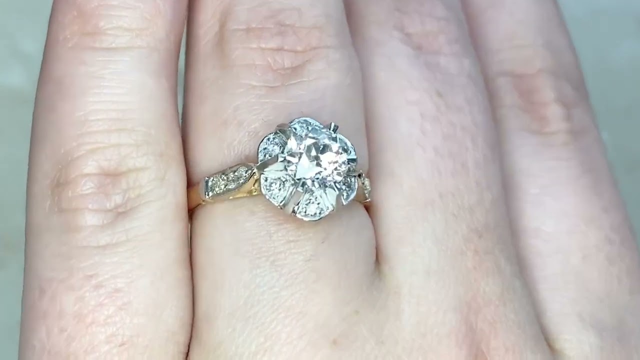 A beautiful antique cluster diamond engagement ring that centers a prong set 0.93 carat old European cut diamond K color and VS2 clarity. Surrounding the diamond is a cluster of additional old European cut diamonds. Accenting the top of this ring are three old European cut diamonds set on each shoulder.