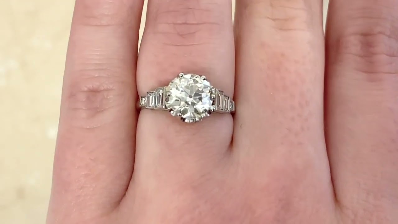 A stunning antique ring handcrafted in platinum. This ring features a lively prong-set old European cut diamond GIA-certified as 1.83 carats, K color, and SI1 clarity. Along the shoulders are three additional baguette-cut diamonds that are bezel-set in platinum and weigh approximately 0.67 carats. This ring was handcrafted in platinum during the Art Deco era.