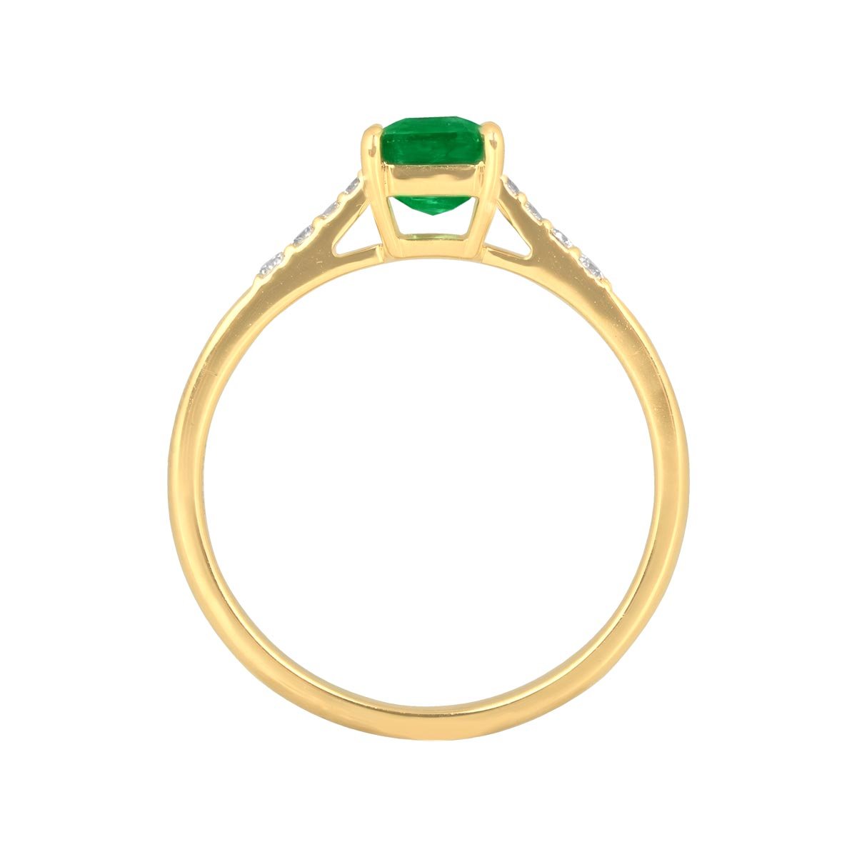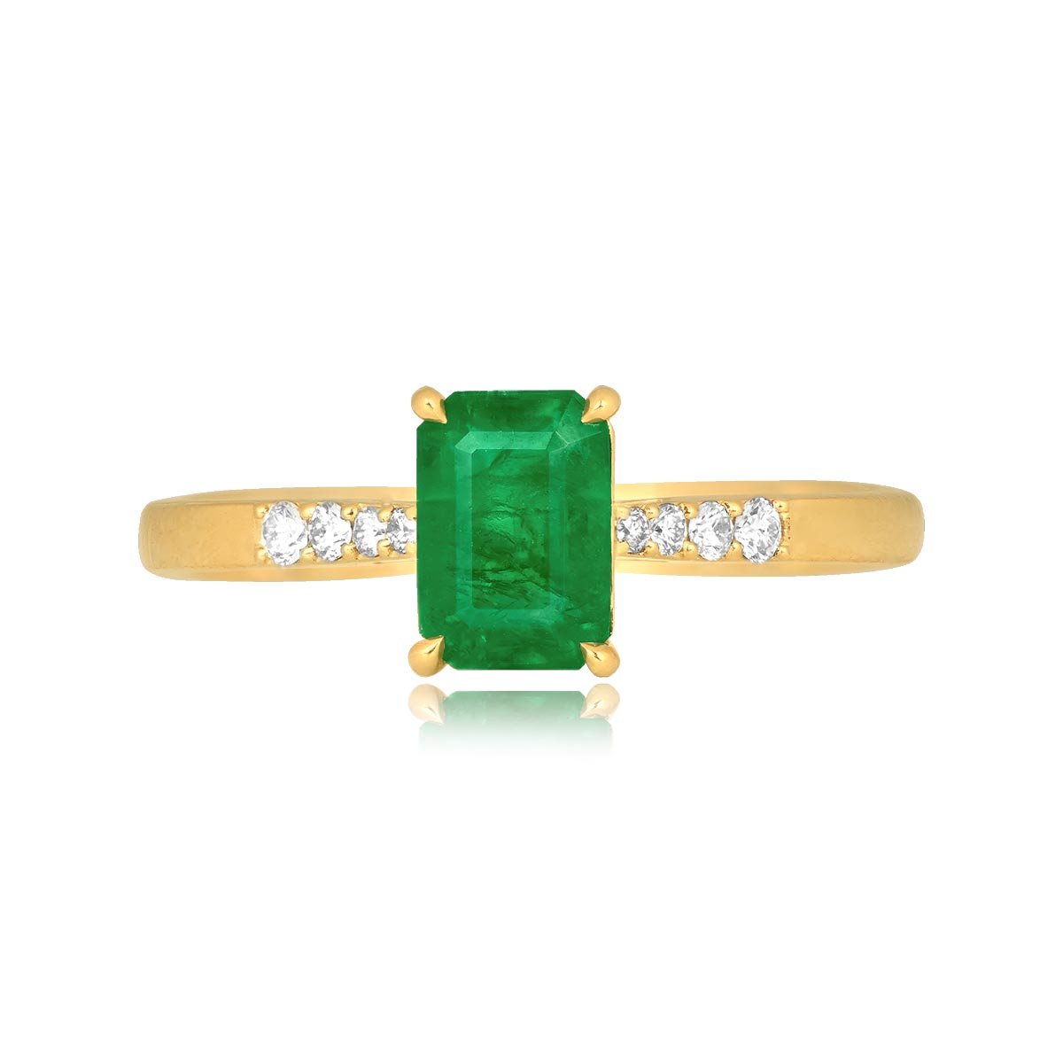 This ring centers a 1.06 carat emerald-cut emerald stone set in prongs. The shoulders of this ring are decorated with round brilliant diamonds in a tapered pattern. The diamonds weigh a total of 0.09 carats. This ring is made in 18k yellow gold.