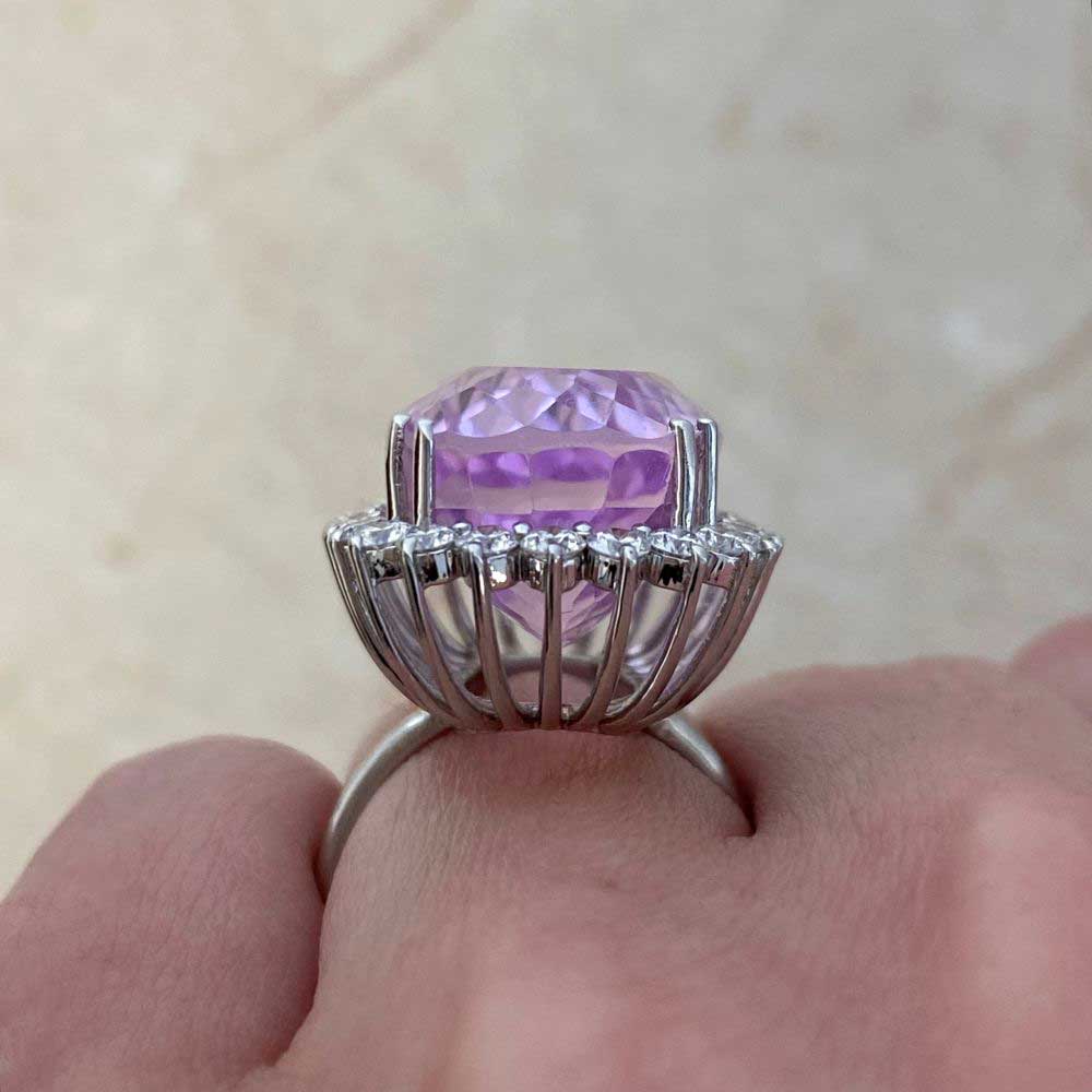 A vintage ring featuring an elongated oval cut 29.29 carat kunzite center stone set in a double prong setting. A cluster of shared-prong diamonds surround the center stone weighing a total of approximately 1.41 carats. This ring was handcrafted in 18k white gold, circa 1990.
