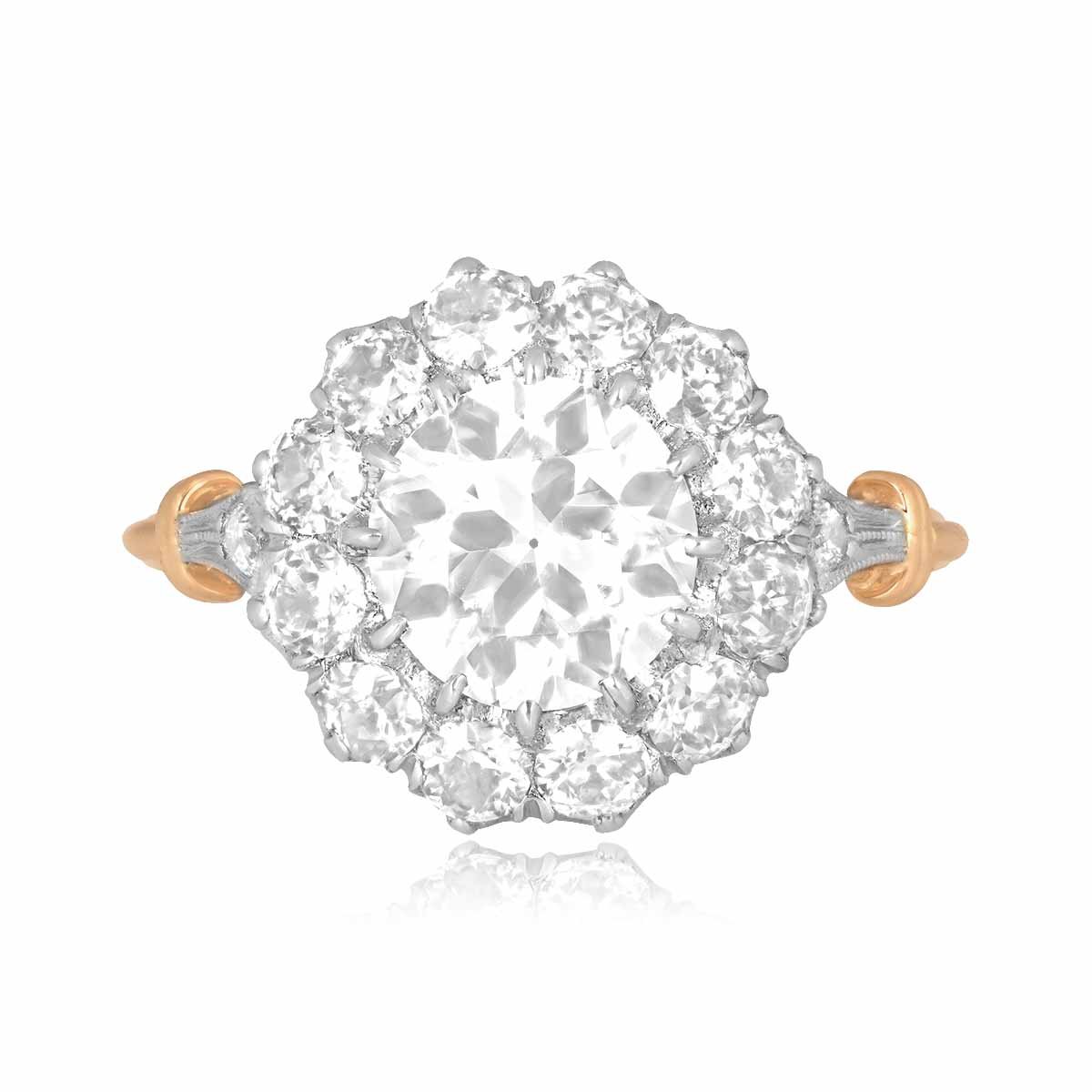 A beautiful cluster ring centering a GIA certified 1.54 carat old European cut diamond with a K color and VS1 clarity. Surrounding the center stone is a cluster of old European cut diamonds. An additional diamond is set on each shoulder leading to a triple wire shank. The additional diamonds weigh a total of approximately 1.00 carat. This ring is crafted in platinum on 18k yellow gold.