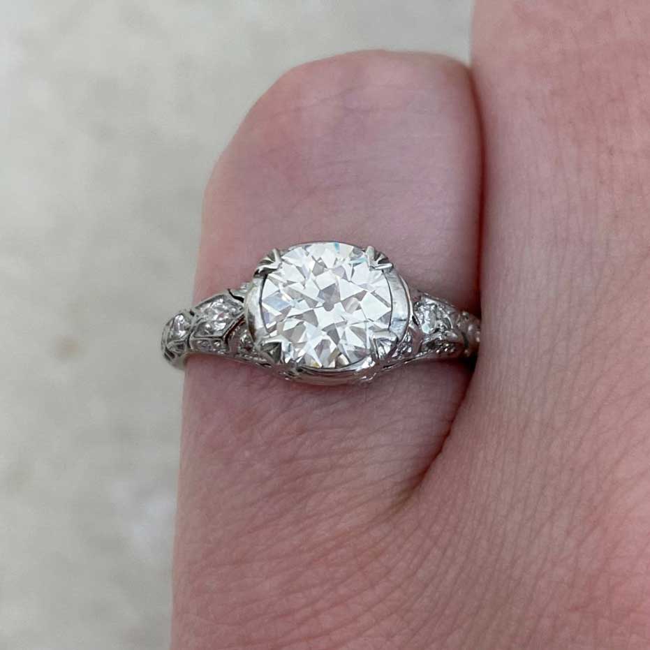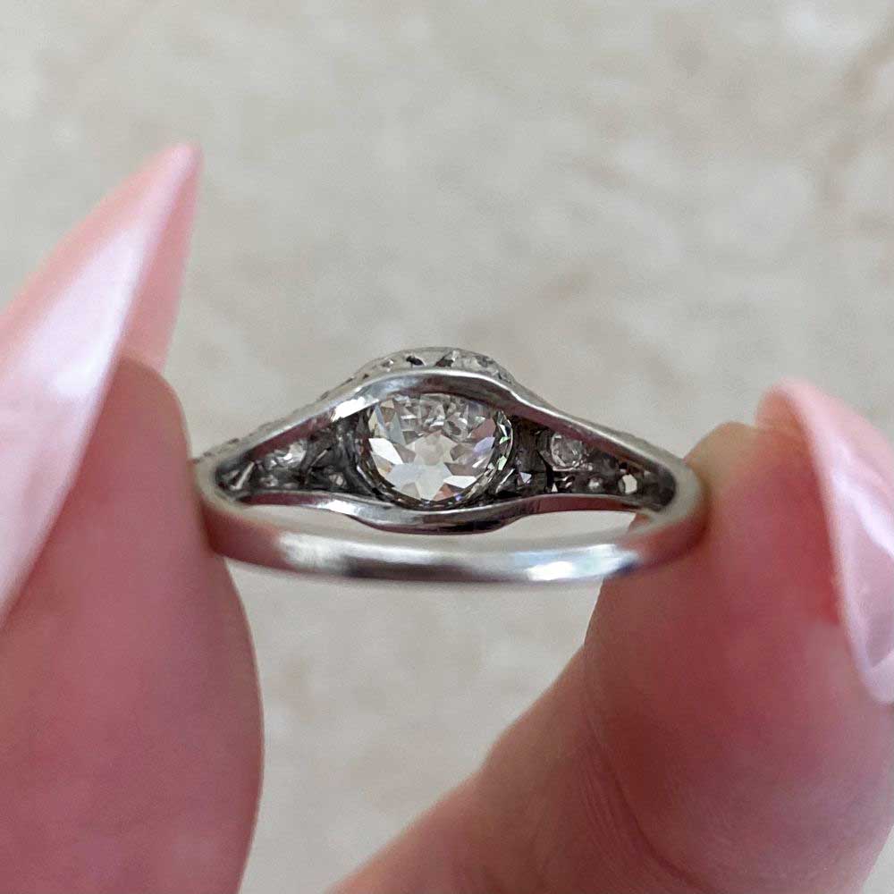 An Edwardian Era ring featuring a GIA certified 1.17 carat Old European cut center diamond with a J color and VS2 clarity. Intricate openwork filigree designs decorate the shoulders and under-gallery of this ring, adorned with additional Old European cut diamonds. The total additional diamond weight is approximately 0.23 carats. This ring was handcrafted in platinum, circa 1910.