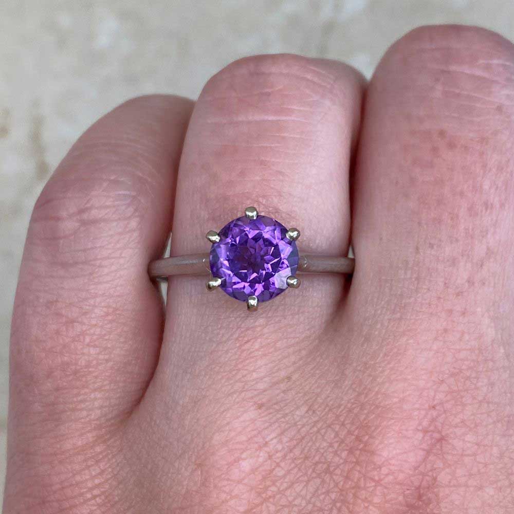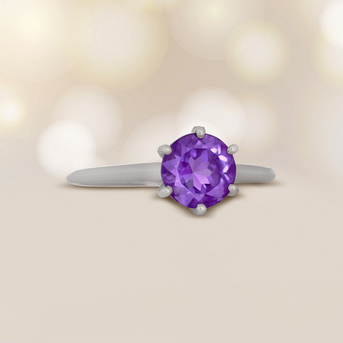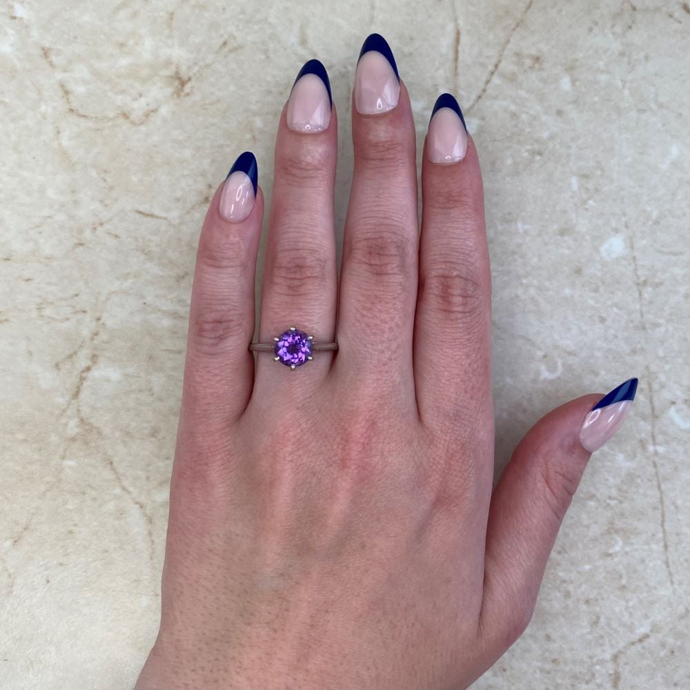 A vintage French ring highlighting a 1.91 carat round cut amethyst center stone in a six prong setting. The under-gallery features a simple open work design. This ring features a French hallmark and is made in platinum, circa 1950.