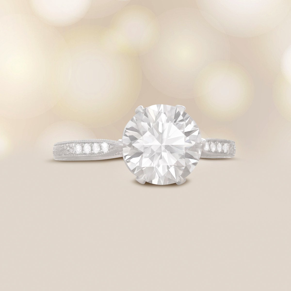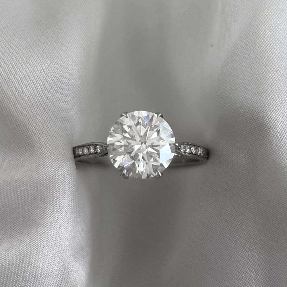 A Word from the Jeweler: The center diamond has an impressive presence, and I like how the engraving continues all the way to the under-gallery. We chose it because that combination of scale and handwork doesn’t come around often.