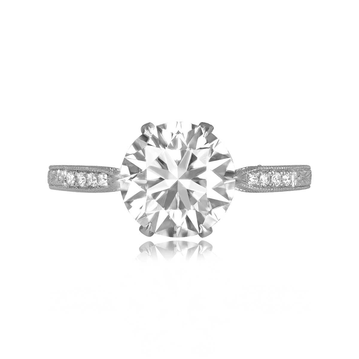 A vintage ring featuring a GIA certified 2.00 carat round brilliant center diamond set in a prong setting with an H color and SI2 clarity. Additional diamonds adorn each shoulder leading to an engraved shank and under-gallery. This ring was handcrafted in platinum.