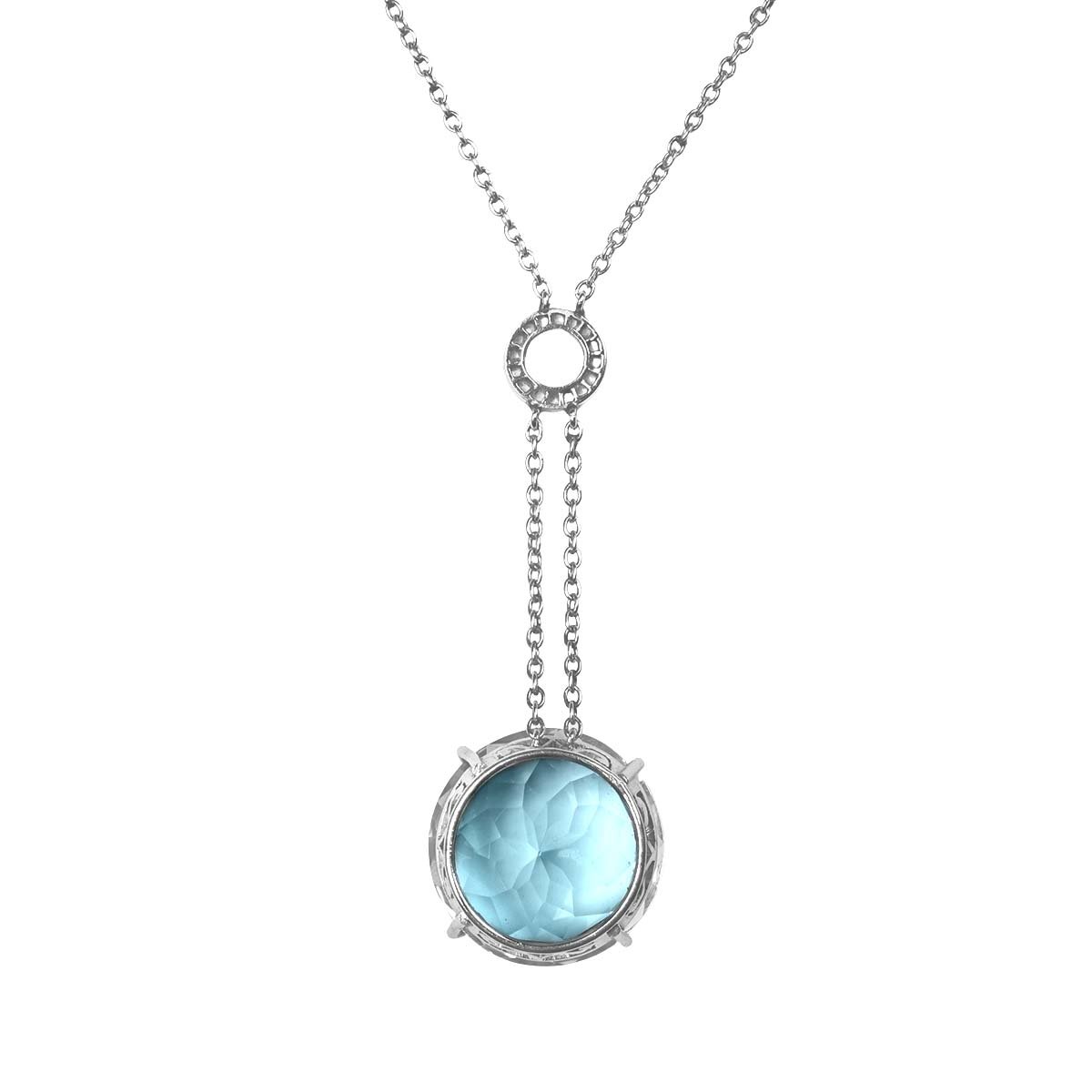 An Art Deco necklace showcasing round aquamarine stone with a beautiful color, set in prongs. The aquamarine stone has an approximate weight of 20.00 carats. Placed above the aquamarine stone is a round frame design adorned with rose cut diamonds and milgrain detailing. This necklace was made in platinum, circa 1920.