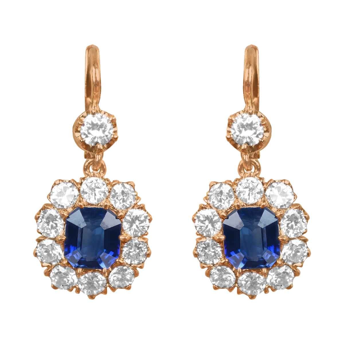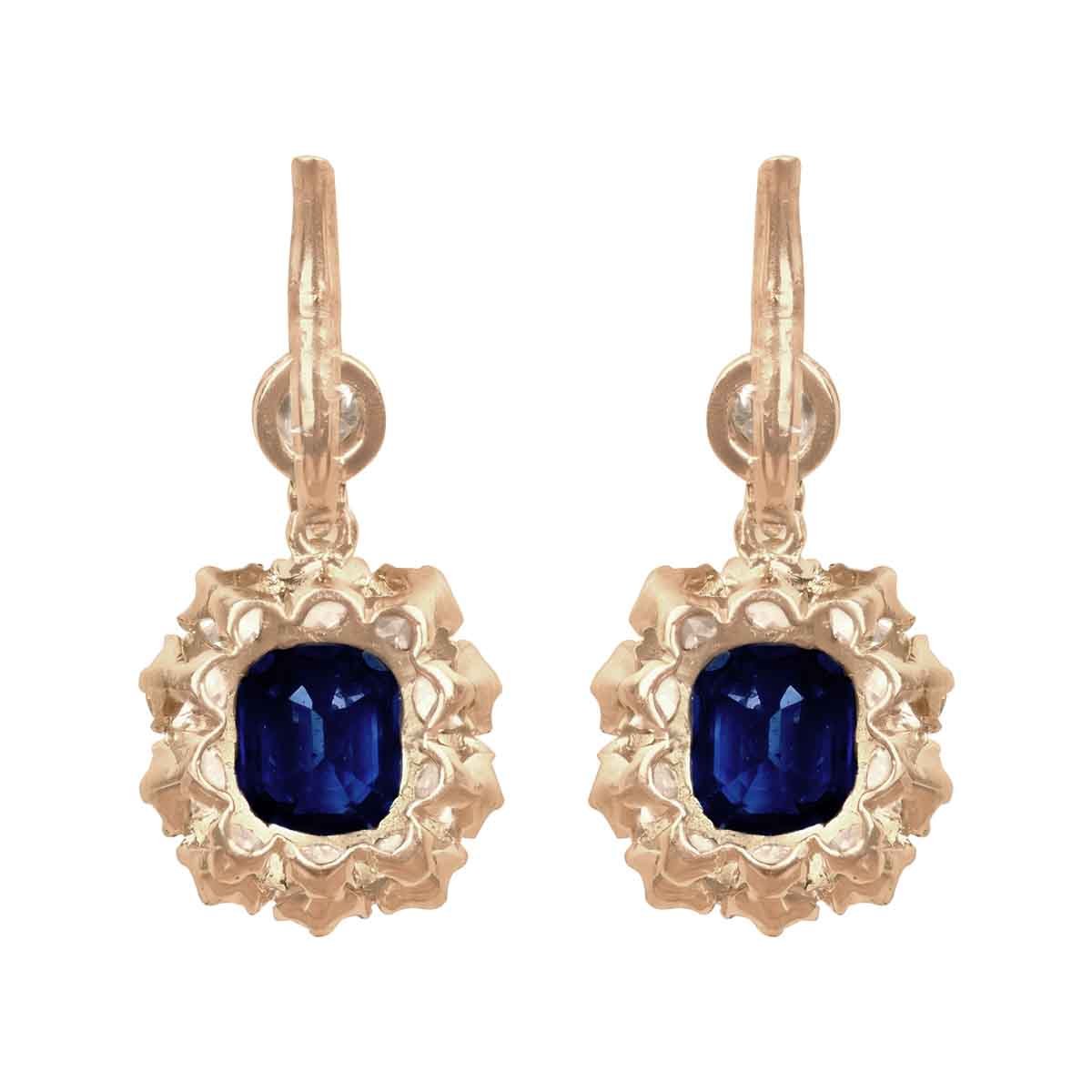 A beautiful pair of floral earrings centering two emerald cut sapphire stones weighing a total of 2.71 carats. Clusters of old European cut diamonds surround the sapphire stones. The top section of each earring features an additional prong-set diamond. The diamonds weigh a total of approximately 2.30 carats. These earrings are made in 18k yellow gold.