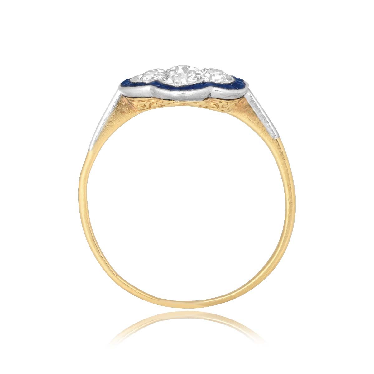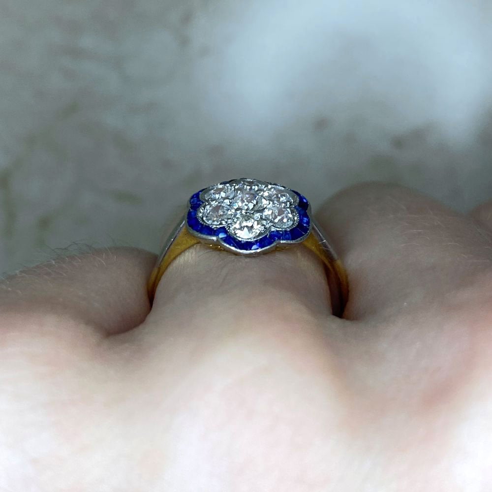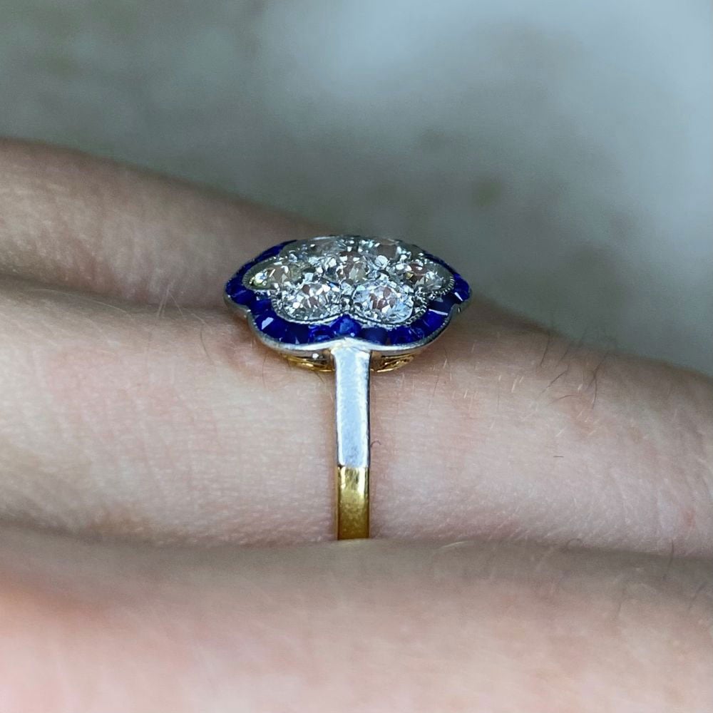 A Word from the Jeweler: I was immediately drawn to the diamond cluster surrounded by a sapphire halo bringing out the romantic elegance of the Edwardian era. The platinum over gold detail adds a touch of sophistication while reflecting the craftsmanship of that period.