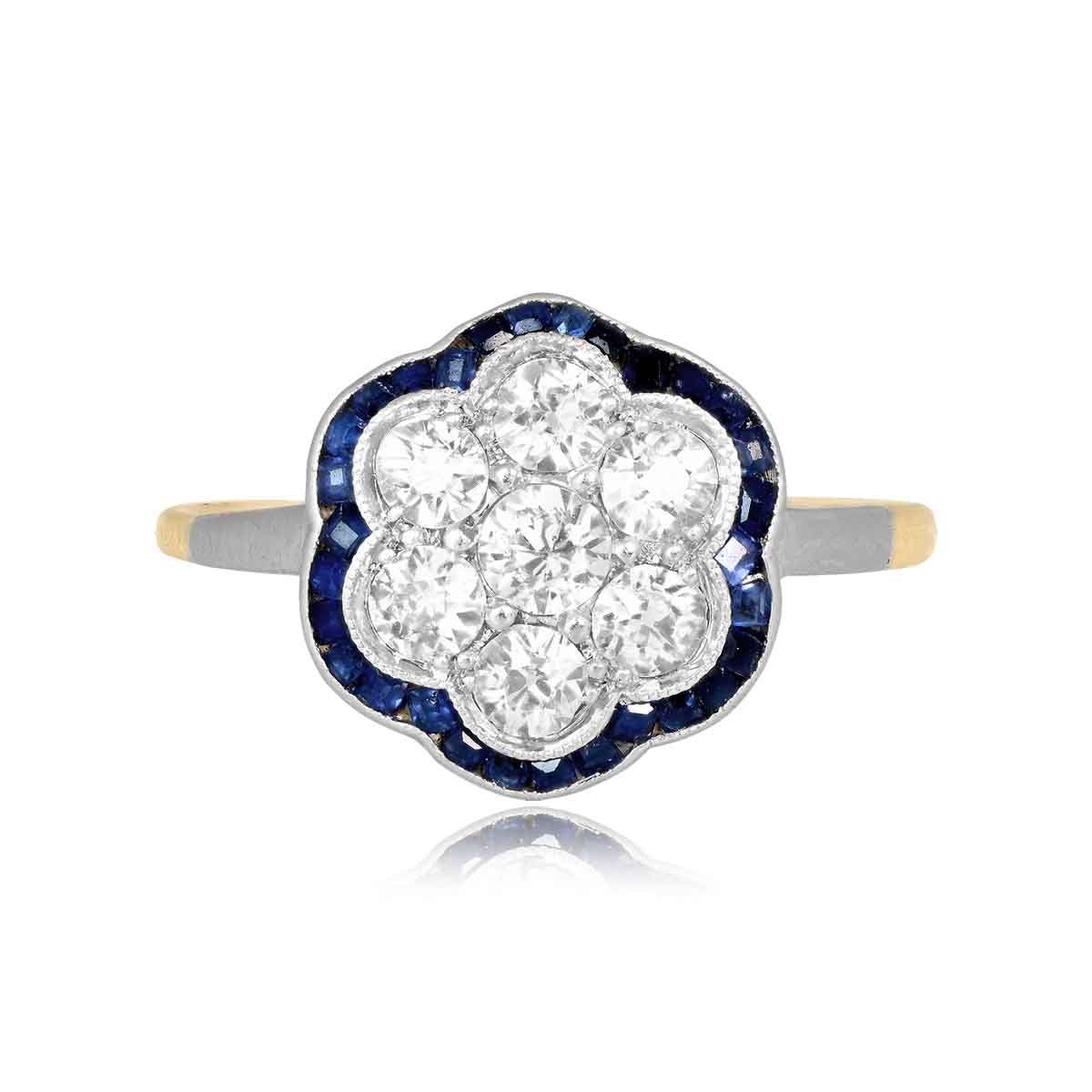 An Edwardian era ring centering a cluster of prong-set old European cut diamonds weighing a total of 0.70 carats. Framing the diamond cluster is a halo of channel-set sapphire stones. The under-gallery of the ring features hand-engraved designs. This ring was handcrafted in platinum on 18k yellow gold, circa 1905.