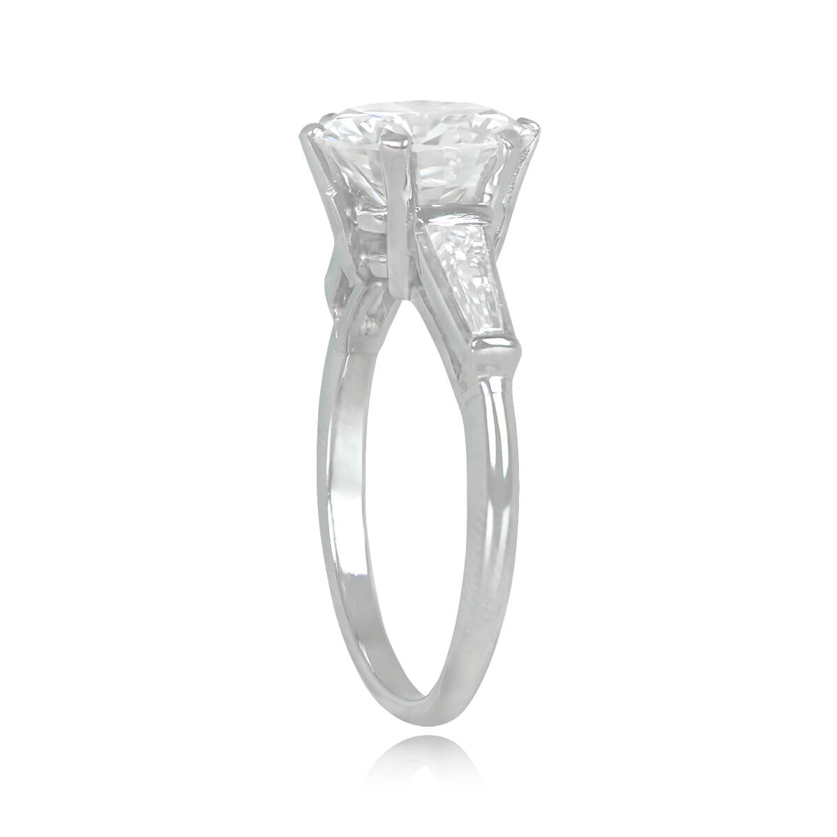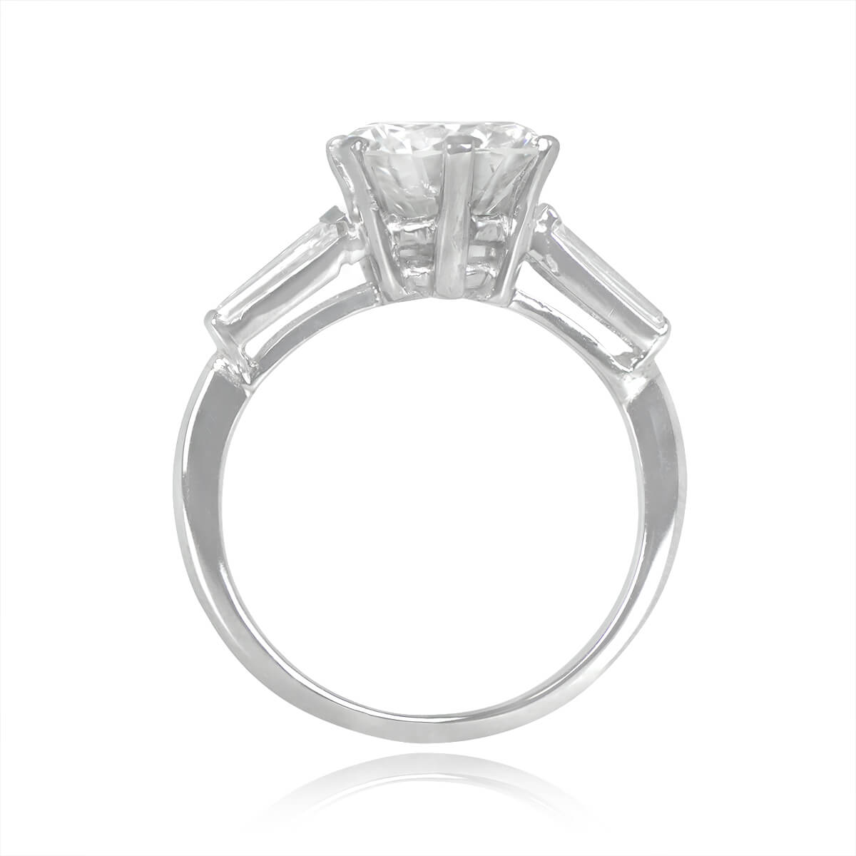 A beautiful round brilliant cut diamond ring centering a GIA certified 2.53 carat diamond, I color and VS2 clarity, set in prongs. Tapered baguette cut diamonds are set on the shoulders. This ring is vintage and hand-crafted in platinum.