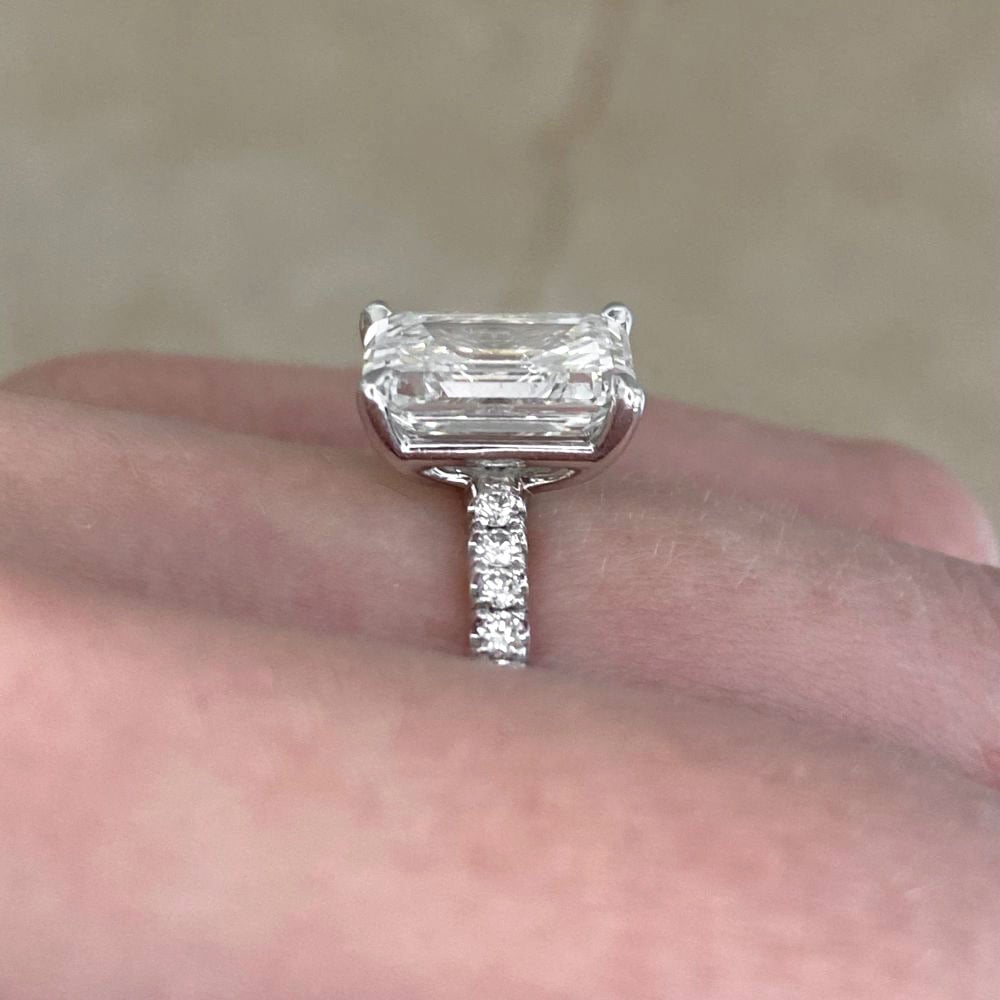 A Word from the Jeweler: I’ve always admired how an emerald-cut diamond draws attention with its crisp lines and mirror-like depth. The diamond-accented band adds just the right touch of sparkle without taking away from the elegance of the center stone.