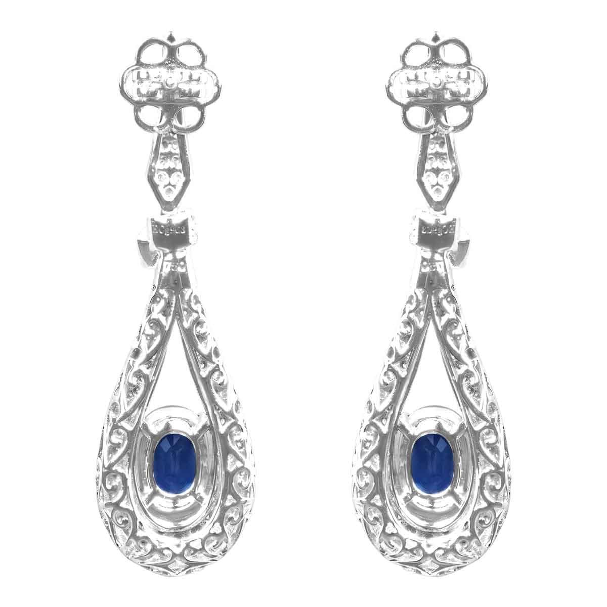 These earrings feature two prong-set oval cut sapphires weighing a total of 2.52 carats. Surrounding each sapphire stone is an intricate drop pattern decorated with pave-set diamonds. The diamonds weigh a total of 1.14 carats. These earrings are made in 18k white gold.