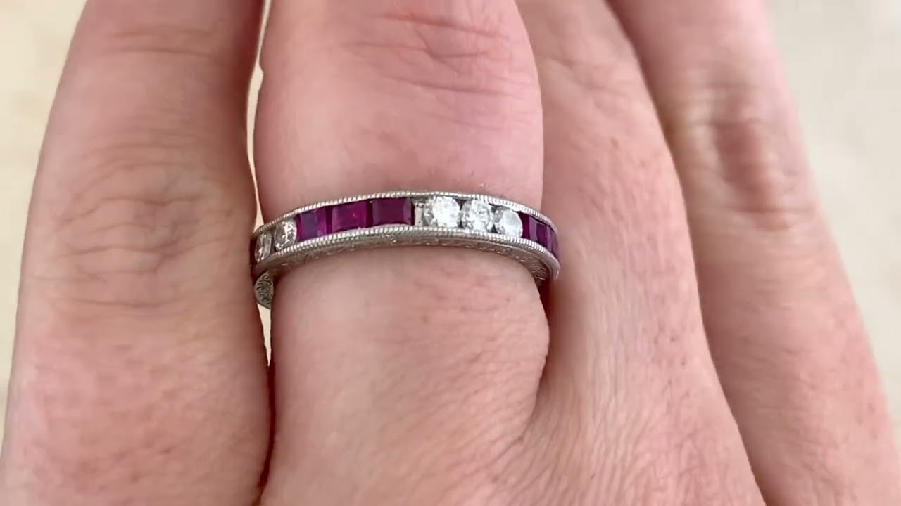 Home / Shop Estate Jewelry Collection / Vintage Wedding Bands / Three by Three Diamond and Ruby Platinum Eternity Tula Band. 3.20mm