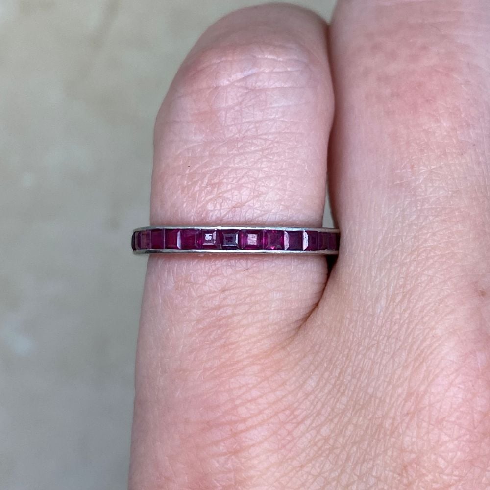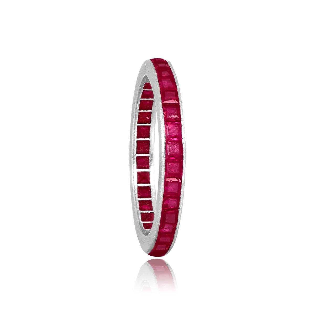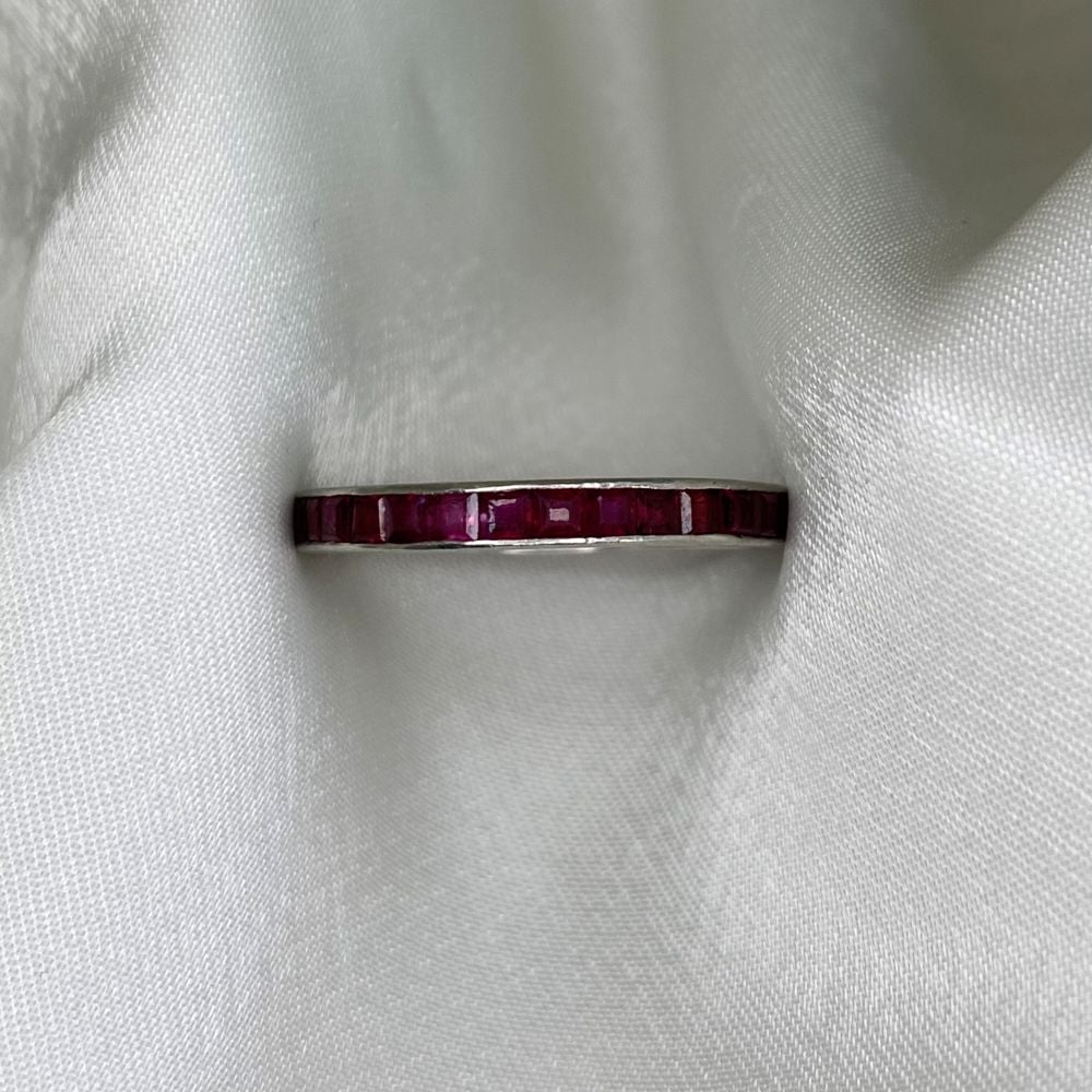 A beautiful vintage eternity band featuring calibre cut rubies set in a channel settings. This band was handcrafted in platinum.