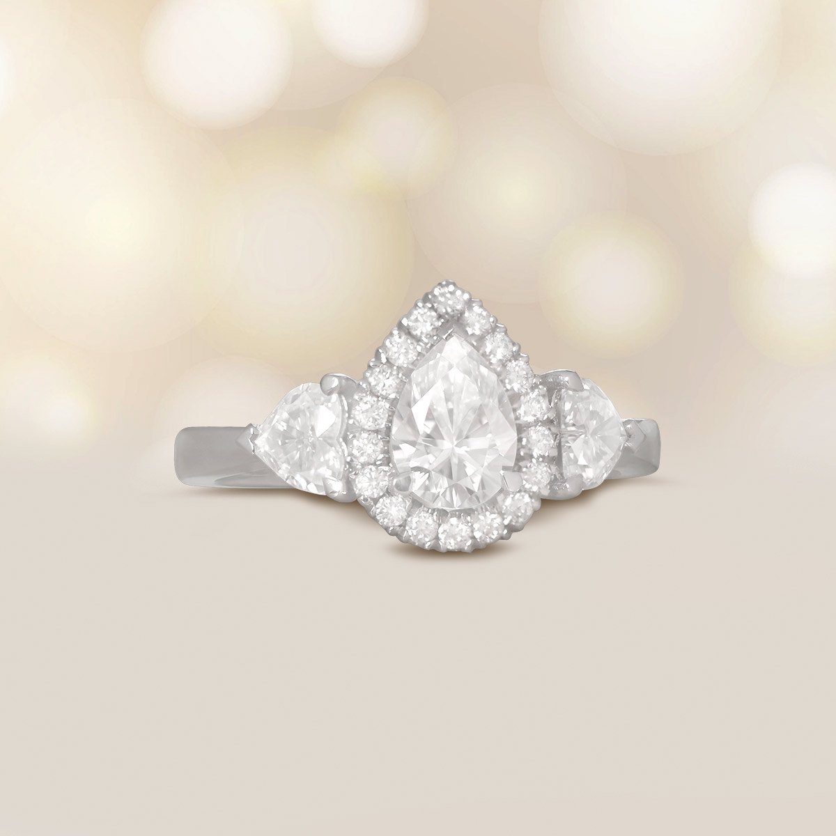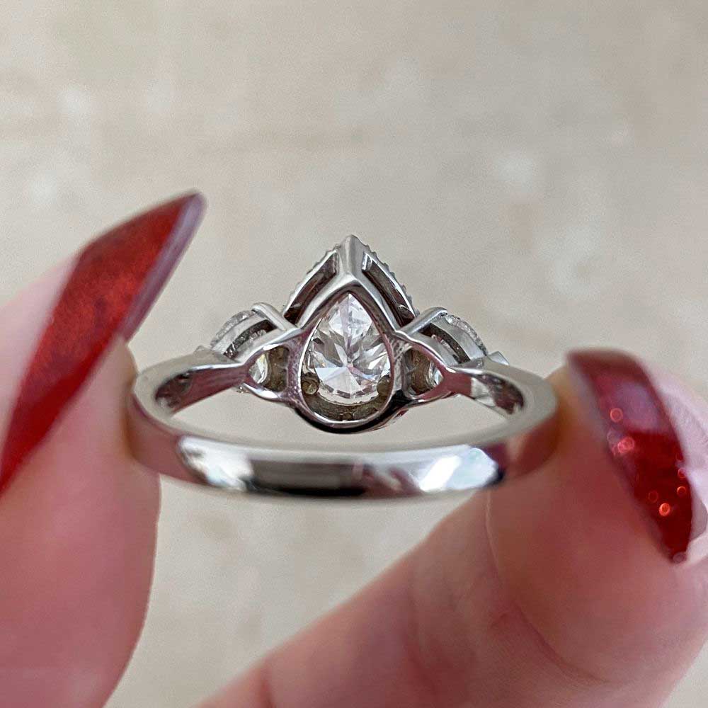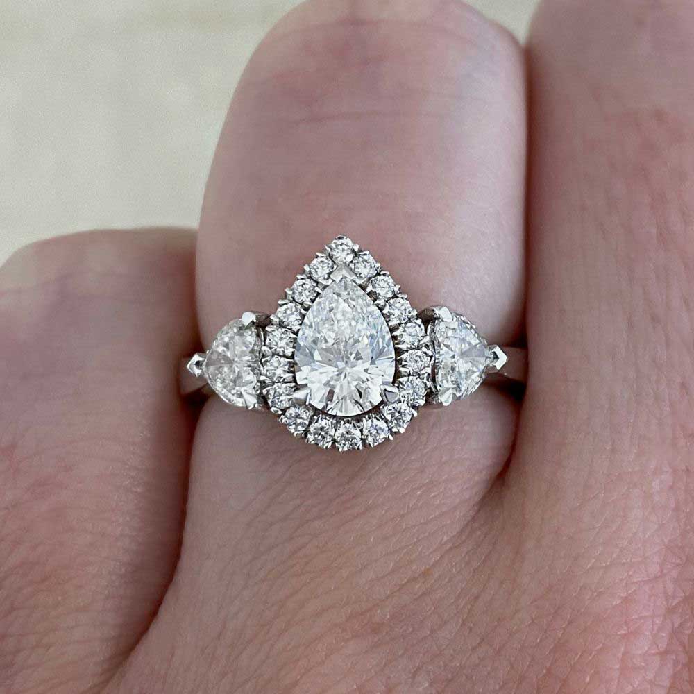 A Word from the Jeweler: The pear shaped center with heart shaped accents feels intentional and balanced, a look I always admire. I’d pair it with a simple diamond eternity band or leave it solo to keep the focus clear.