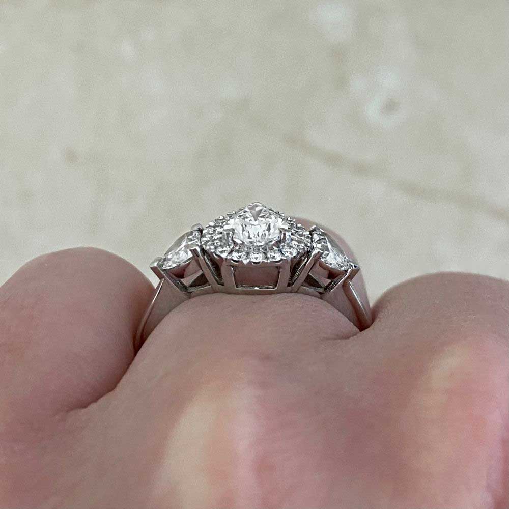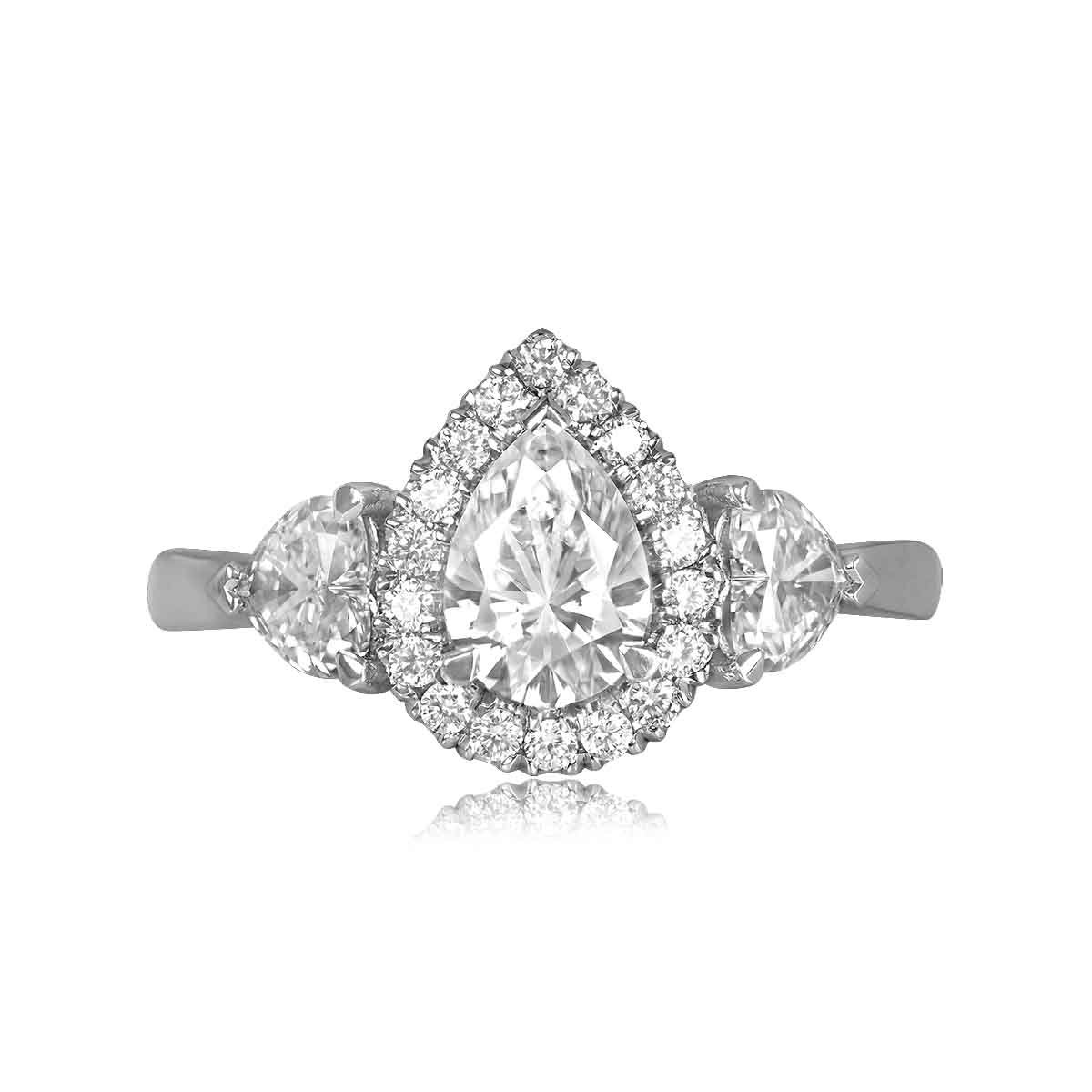 A stunning estate ring featuring a 0.73 carat pear shaped center diamond set in a prong setting with a G color and VS2 clarity. A halo of shared-prong diamonds surrounds the center stone. Two heart shaped diamonds, weighing a total of 0.51 carats, flank the pear-shaped center diamond and its halo. This ring was made in 18k white gold.