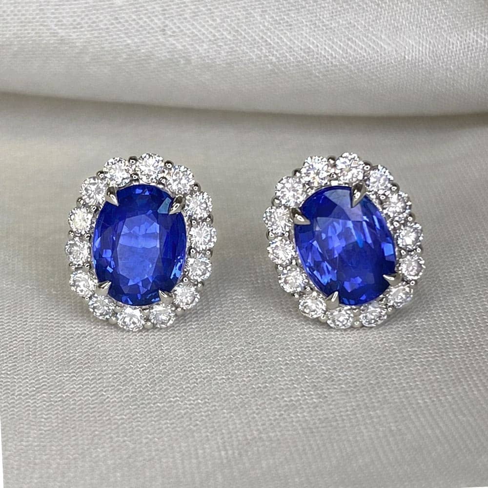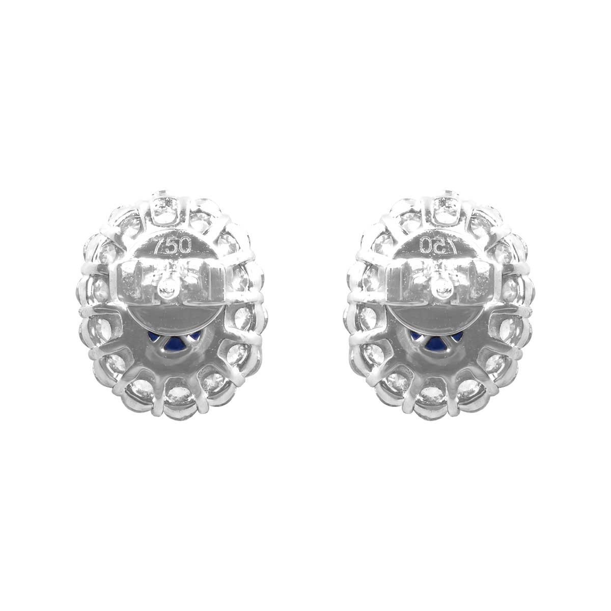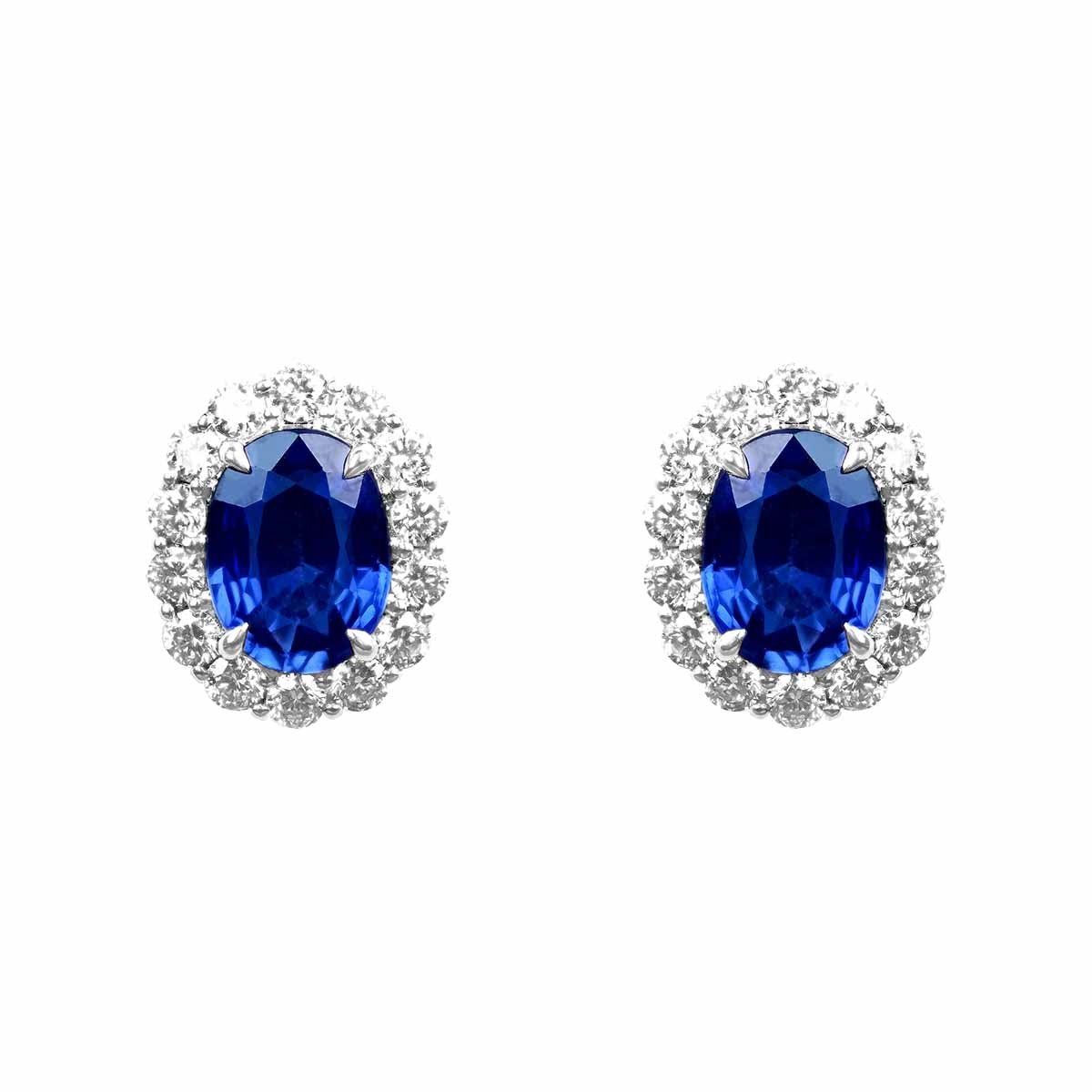A pair of stud earrings centering two oval cut sapphire stones set in prong settings. The sapphires weigh a total of 1.83 carats. Surrounding the sapphire stones are clusters of shared-prong diamonds. The diamonds weigh a total of 0.49 carats. These earrings are made in 18k white gold.