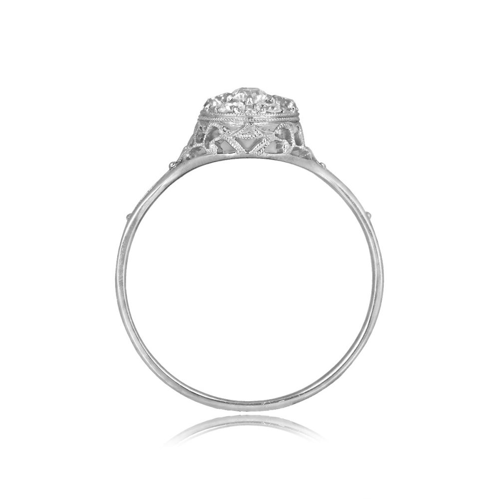 This ring features a center cluster of shared prong Old European cut diamonds in an oval bezel setting. The total diamond weight is approximately 0.36 carats with an overall I color and VS2 clarity overall. The under-gallery and shoulders of this ring are decorated with filigree and milgrain detailing. This ring was handcrafted in platinum.