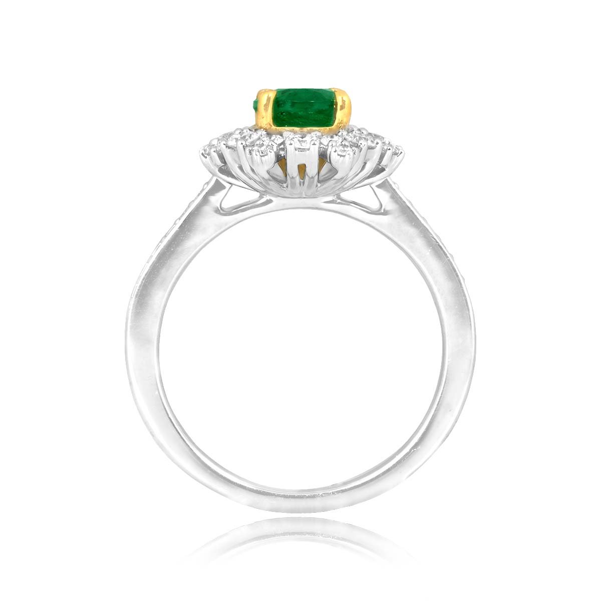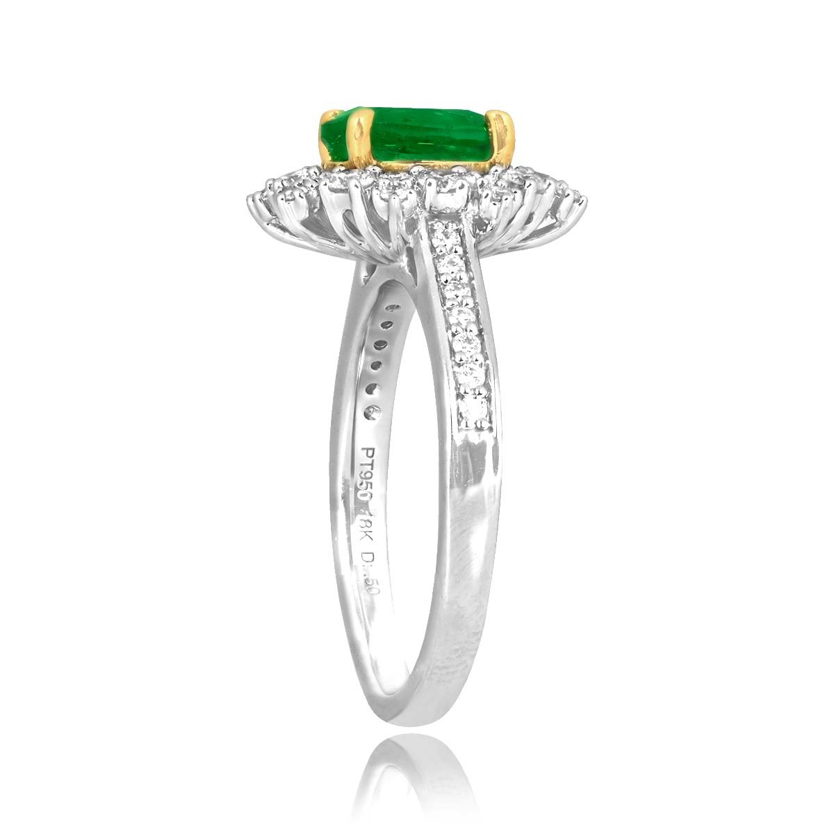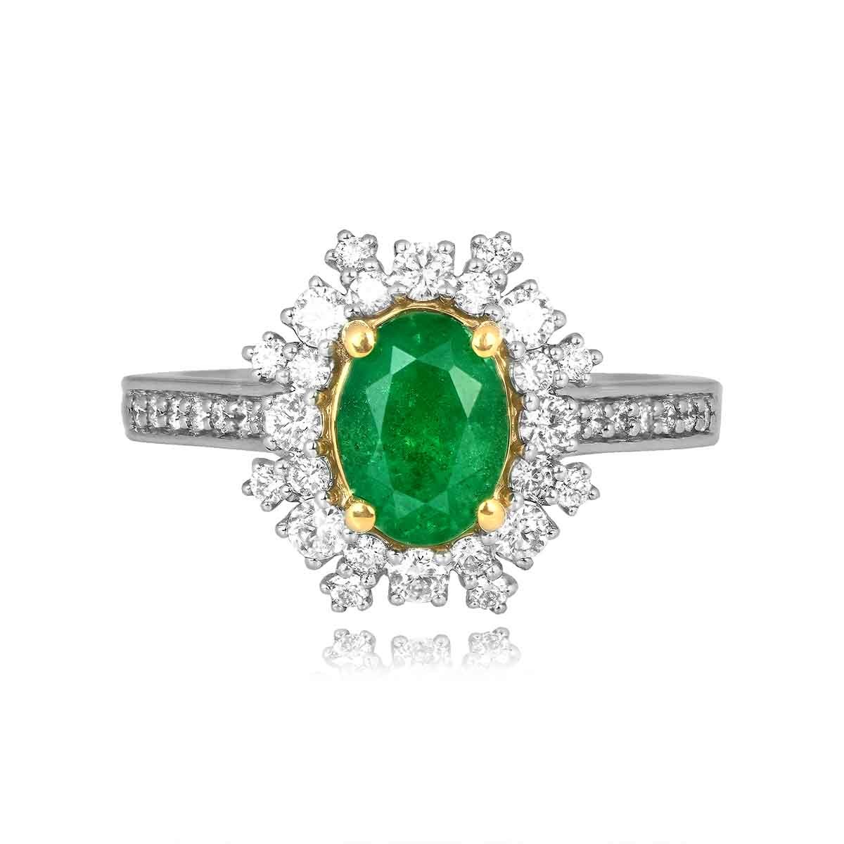 This ring centers a 1.00 carat oval-cut emerald stone set in a prong setting. Surrounding the center stone is a cluster of round diamonds. Additional diamonds are pave-set along the shoulders of this ring. The diamonds weigh a total of 0.50 carats. This ring is made in platinum and 18k yellow gold.