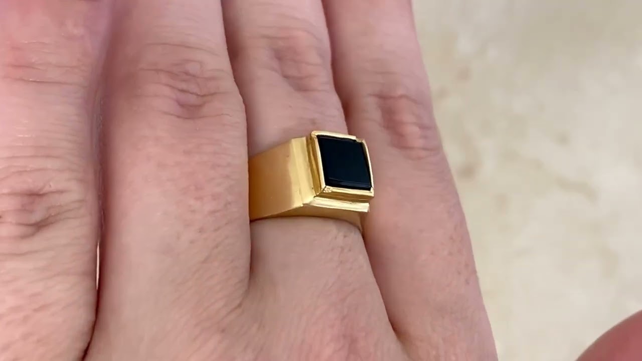 A Men’s ring featuring a square-shaped inlay of onyx set in 18k yellow gold.