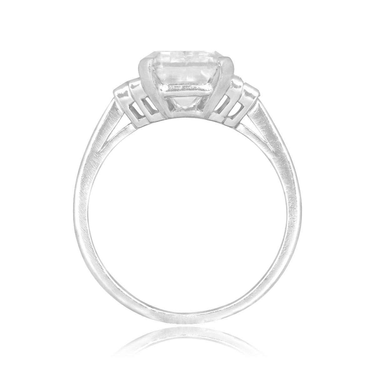 A beautiful ring centering a GIA certified 4.05 carat emerald cut diamond with a J color and VS2 clarity. Accenting the center diamond are baguette cut diamonds in a step design weighing a total of approximately 0.52 carats. This ring is crafted in platinum.