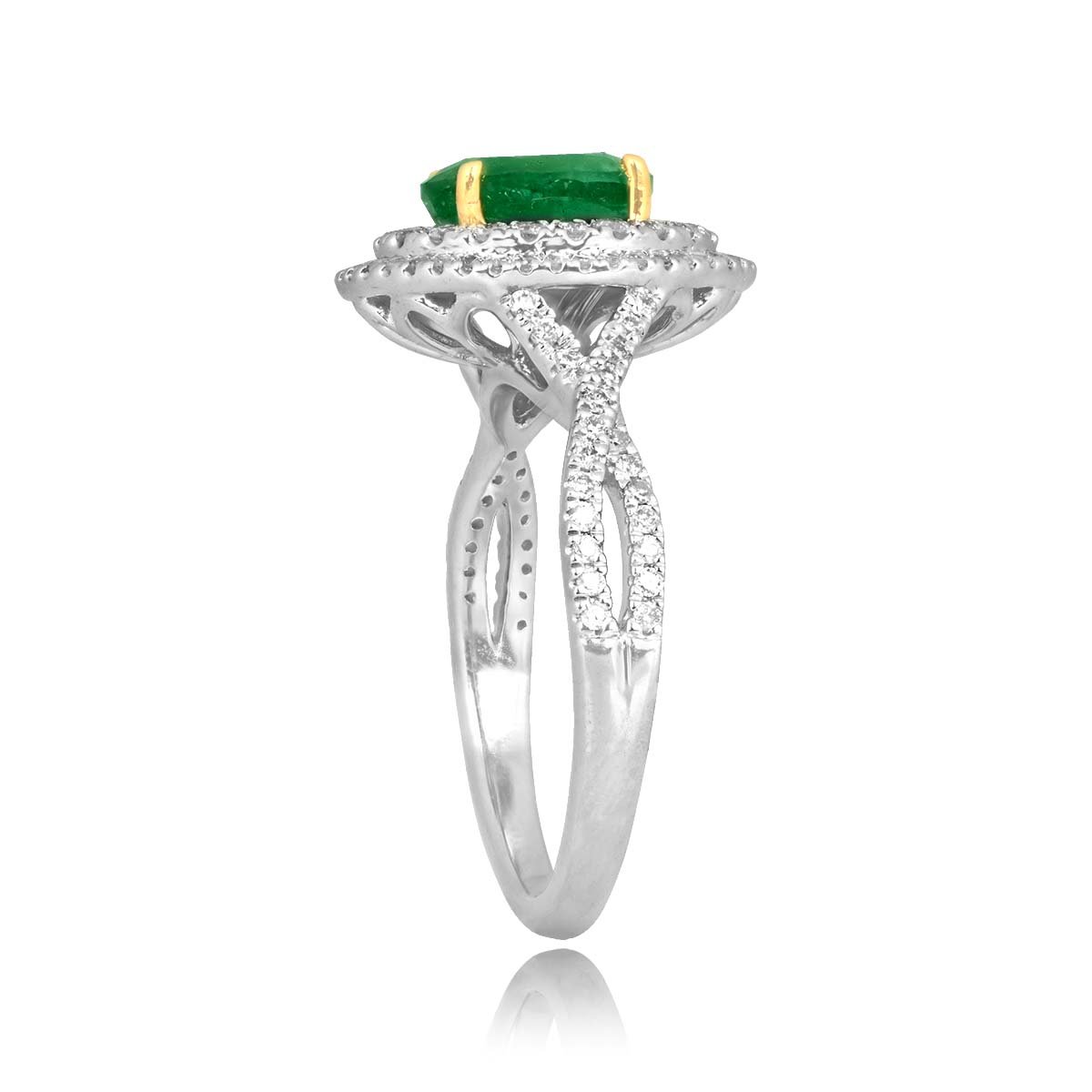 A beautiful ring featuring a 1.00 carat oval-cut emerald center stone set in 18k yellow gold prongs. The center stone is surrounded by a double halo of round diamonds. The shoulders of this ring are decorated with an twist design adorned with additional diamonds. The diamonds weigh a total of 0.50 carats. This ring was made in platinum.